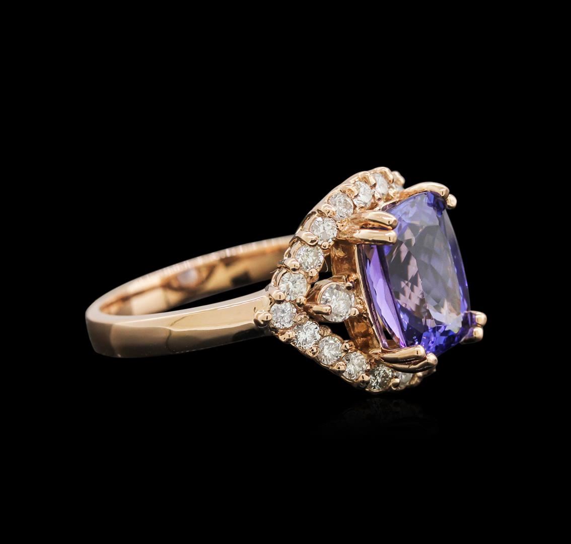One electronically tested 14KT rose gold lady's cast fashion ring with a basket halo with a bright polish finish. The featured lady's ring has a shank measuring 2.50 millimeters wide. Identified with markings of "K14". Condition is new, good workmanship. Containing: One prong set rectangular cushion modified brilliant cut natural tanzanite, measuring 10.04 x 7.60 x 5.65mm, approximate weight of 3.46ct., clarity is eye clean, type I, dark, very slightly grayish, violetish blue color, (GIA vB 7/3), cut is good. Transmitting light with no distortion, transparent. Colored gemstones are presumed to have been subjected to commonly used enhancement processes. Graded in the setting. Two prong set round brilliant cut diamonds, measuring 2.50 - 2.45 x 1.61mm (depth est.) approximate total weight of 2 Stones = 0.12ct. Clarity: SI-2 to I-1. Color: H - I. Cut Good Twenty-Two prong set round brilliant cut diamonds, measuring 1.80 - 1.75 x 1.16mm (depth est.) approximate total weight of 22 Stones = 0.50ct. Graded in the setting. Clarity: SI-2 to I-1. Color: H - I. Cut Good. Total Weight of Colored Stones 3.46ct. Total Weight of Diamonds 0.62ct. Total Weight of Ring 5.70gm. GAS Appraised at $6,670.00.