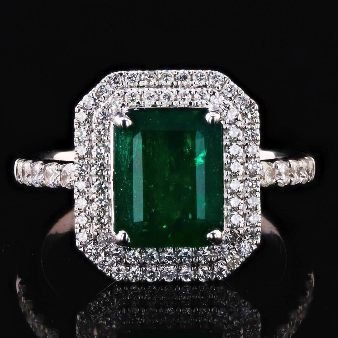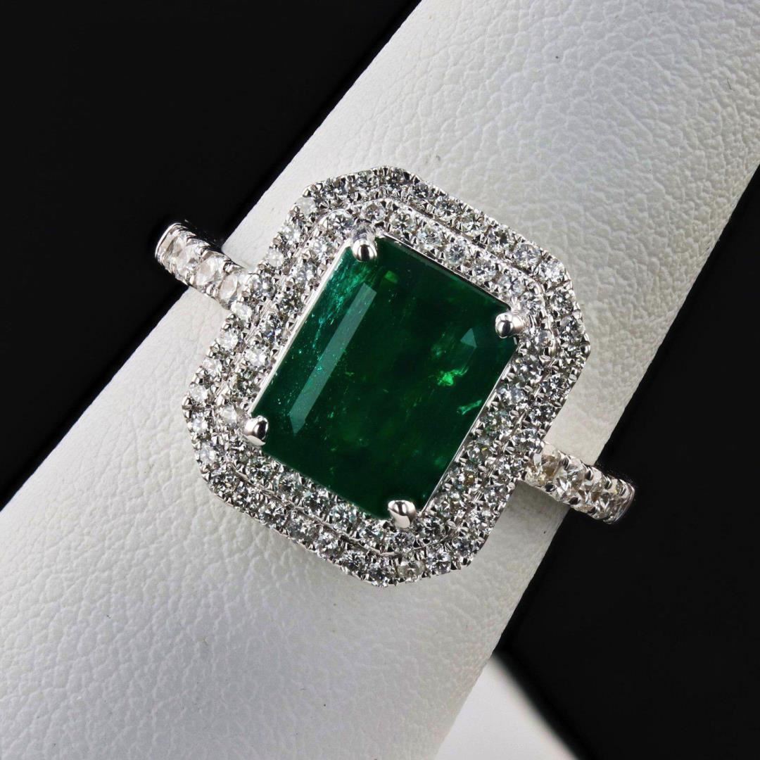 ONE 14K WHITE GOLD LADY'S CUSTOM MADE EMERALD & DIAMOND RING. 5.40 GR TW *MAIN CENTER GEMSTONE(S)* IDENTITY: ONE CENTER NATURAL EMERALD SET IN 4 PRONGS SETTING CARAT WEIGHT: 3.47 CTS SHAPE & MEASUREMEMT: EMERALD CUT APPROX: 9.56 X 7.49MM QUALITY: FINE DARK GREEN, GOOD CLARITY & CUT *ADJACENT GEMSTONES* IDENTITY: NATURAL DIAMONDS ON DOUBLE HALO & SIDE RING SHAPE: ROUND BRILLIANT CUT CARAT WEIGHT: 0.56 CT QUALITY: G/H COLOR , SI1/2 CLARITY