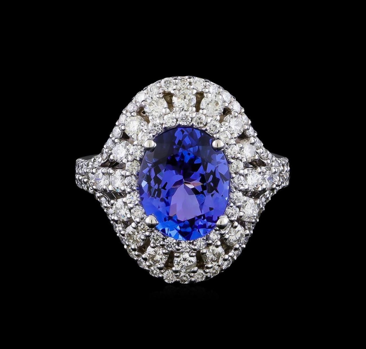 One electronically tested 14KT white gold lady's cast fashion ring with a split shank double basket halo with a bright polish finish. The featured lady's ring has a shank measuring 3.51 millimeters in width. Identified with markings of "K14". Condition is new, good workmanship. Containing: One prong set oval oval modified brilliant cut natural tanzanite, measuring 11.02 x 8.83 x 5.31mm, (depth est.) approximate weight of 3.47ct., clarity is eye clean, medium, moderately strong, violetish blue color, (GIA vB 5/4), cut is very good. Transmitting light with no distortion, transparent. Colored gemstones are presumed to have been subjected to commonly used enhancement processes. Graded in the setting. Two prong set round brilliant cut diamonds, measuring 2.00 - 1.95 x 1.23mm (depth est.) approximate total weight of 2 Stones = 0.06ct. Graded in the setting. Clarity: SI-2. Color: Good Eighteen prong set round brilliant cut diamonds, measuring 2.20 - 2.15 x 1.35mm (depth est.) approximate total weight of 18 Stones = 0.75ct. Graded in the setting. Clarity: SI-1 to SI-2. Color: H - I. Cut Good Seventy-Eight prong set round brilliant cut diamonds, measuring 1.40 - 1.30 x 0.84mm (depth est.) approximate total weight of 78 Stones = 0.76ct. Graded in the setting. Clarity: SI-1 to SI-2. Color: H - I. Cut Good. Total Weight of Colored Stones 3.47ct. Total Weight of Diamonds 1.57ct. Total Weight of Ring 8.40gm. GAS Appraised.