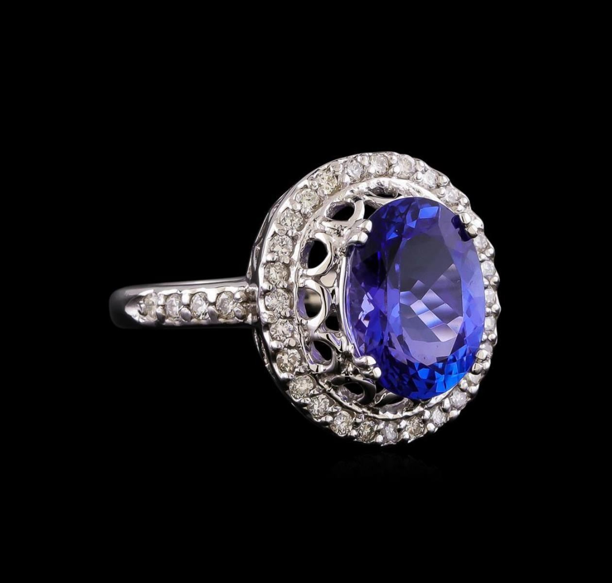 One electronically tested 14KT white gold lady's cast fashion ring with a halo with a bright polish finish. The featured lady's ring has a shank measuring 2.20 millimeters wide. Identified with markings of "14K". Condition is new, good workmanship. Containing: One prong set oval modified brilliant cut natural tanzanite, measuring 11.17 x 8.30 x 5.57mm, (depth est.) approximate weight of 3.50ct., clarity is eye clean, medium dark, moderately strong, violetish blue color, (GIA vB 6/4), cut is very good. Transmitting light with no distortion, transparent. Colored gemstones are presumed to have been subjected to commonly used enhancement processes. Graded in the setting. Eight prong set round brilliant cut diamonds, measuring 1.60 - 1.55 x 0.98mm (depth est.) approximate total weight of 8 Stones = 0.12ct. Graded in the setting. Clarity: SI-1 to SI-2. Color: H - I. Cut Good Twenty-Eight prong set round brilliant cut diamonds, measuring 1.40 - 1.35 x 0.86mm (depth est.) approximate total weight of 28 Stones = 0.28ct. Graded in the setting. Clarity: SI-1 to SI-2. Color: H - I. Cut Good. Total Weight of Colored Stones 3.50ct. Total Weight of Diamonds 0.40ct. Total Weight of Ring 5.60gm.