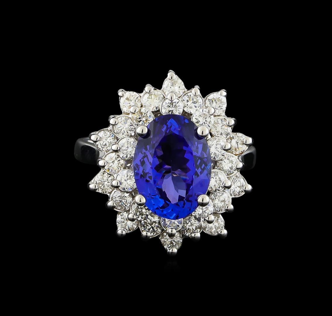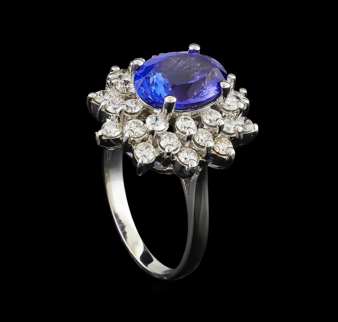 One electronically tested 14KT white gold lady's cast fashion ring with a double basket halo with a bright polish finish. The featured lady's ring has a shank measuring 2.05 millimeters wide. Identified with markings of "K14". Condition is new, good workmanship. Containing: One prong set oval modified brilliant cut natural tanzanite, measuring 11.05 x 8.16 x 5.34mm, approximate weight of 3.50ct., clarity is eye clean, type I, medium dark, moderately strong, violetish blue color, (GIA vB 6/4), cut is very good. Transmitting light with no distortion, transparent. Colored gemstones are presumed to have been subjected to commonly used enhancement processes. Graded in the setting. Thirty prong set round brilliant cut diamonds, measuring 2.30 - 2.20 x 1.40mm (depth est.) approximate total weight of 30 Stones = 1.31ct. Graded in the setting. Clarity: VS-2 to SI-2. Color: H - I. Cut Good. Total Weight of Colored Stones 3.50ct. Total Weight of Diamonds 1.31ct. Total Weight of Ring 6.20gm GAS Appraised.