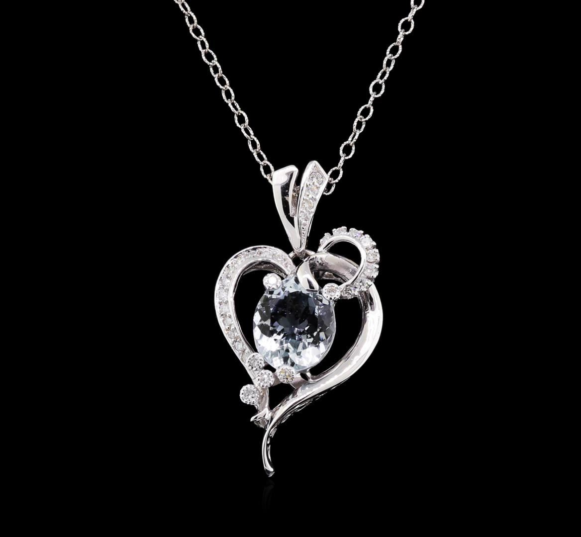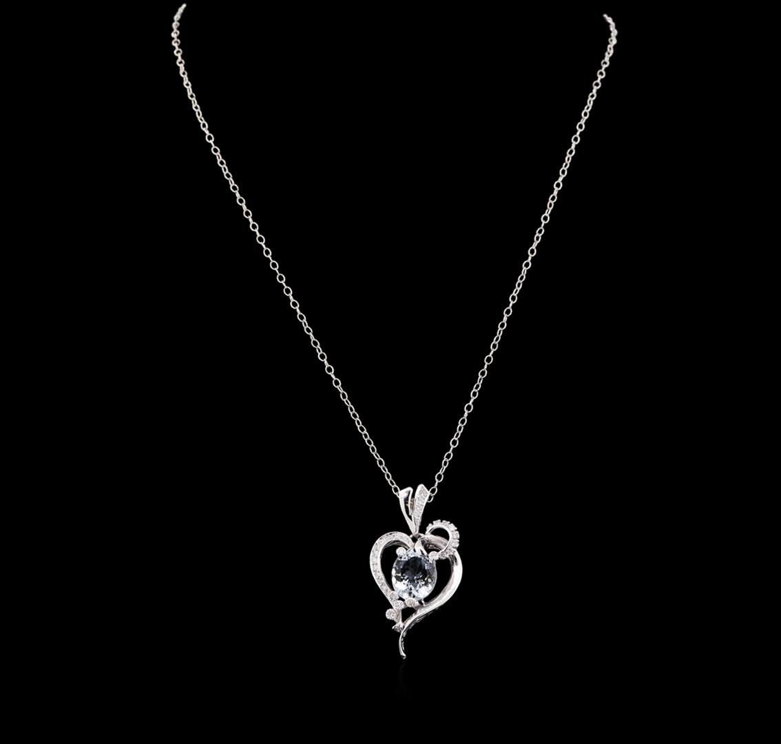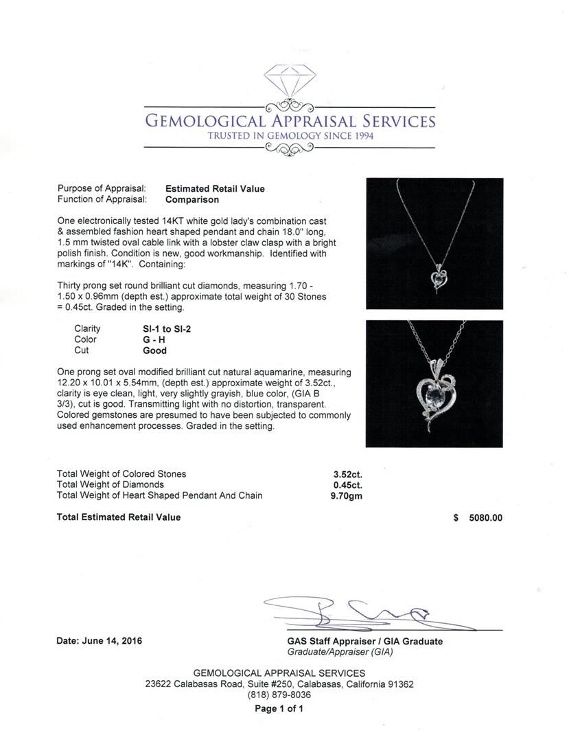 One electronically tested 14KT white gold lady's combination cast & assembled fashion heart shaped pendant and chain 18.0" long, 1.5 mm twisted oval cable link with a lobster claw clasp with a bright polish finish. Identified with markings of "14K". Condition is new, good workmanship. Containing: Thirty prong set round brilliant cut diamonds, measuring 1.70 - 1.50 x 0.96mm (depth est.) approximate total weight of 30 Stones = 0.45ct. Graded in the setting. Clarity: SI-1 to SI-2. Color: G - Good One prong set oval modified brilliant cut natural aquamarine, measuring 12.20 x 10.01 x 5.54mm, (depth est.) approximate weight of 3.52ct., clarity is eye clean, light, very slightly grayish, blue color, (GIA B 3/3), cut is good. Transmitting light with no distortion, transparent. Colored gemstones are presumed to have been subjected to commonly used enhancement processes. Graded in the setting. Total Weight of Colored Stones 3.52ct. Total Weight of Diamonds 0.45ct. Total Weight of Heart Shaped Pendant And Chain 9.70gm. GAS Appraised.