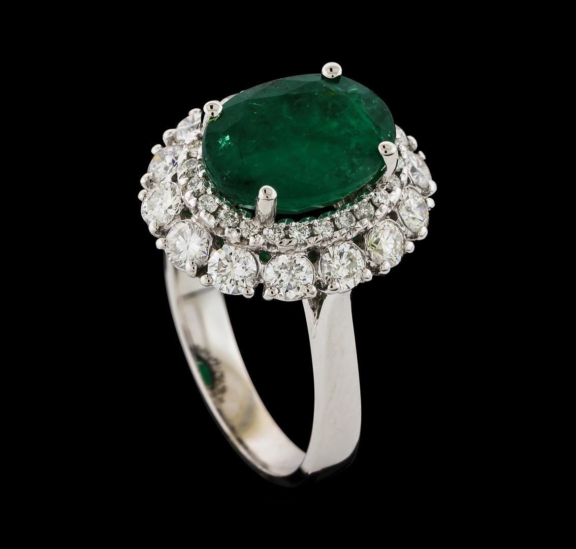 One electronically tested 14KT white gold lady's cast fashion ring with a double basket halo with a bright polish finish. The featured lady's ring has a shank measuring 3.00 millimeters wide. Identified with markings of 'K14'. Condition is new, good workmanship. Containing: One prong set oval modified mixed cut natural emerald, measuring 11.30 x 8.38 x 5.47mm, (depth est.) 15%. bulge factor, approximate weight of 3.53ct., clarity is heavily included, medium dark, moderately strong, green color, (GIA G 6/4), cut is good. Transmitting light somewhat diffusely, semi-transparent to translucent. Naturally occurring internal & external characteristics are present. Indications of oil residue. Colored gemstones are presumed to have been subjected to commonly used enhancement processes. Graded in the setting. Fourteen prong set round brilliant cut diamonds, measuring 2.75 - 2.65 x 1.67mm (depth est.) approximate total weight of 14 Stones = 1.05ct. Graded in the setting. Clarity SI-1 to I-1. Color: G - H Cut Good Twenty-Four prong set round brilliant cut diamonds, measuring 1.35 - 1.25 x 0.78mm (depth est.) approximate total weight of 24 Stones = 0.19ct. Graded in the setting. Clarity SI-1 to SI-2. Color: G - I Cut Good. Total Weight of Colored Stones 3.53ct.. Total Weight of Diamonds 1.24ct.. Total Weight of Ring 5.30gm. GAS Appraised.