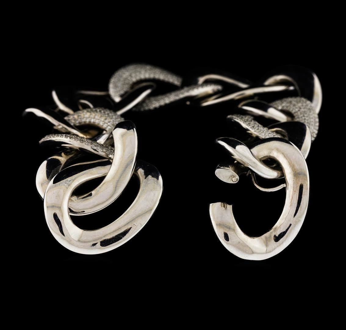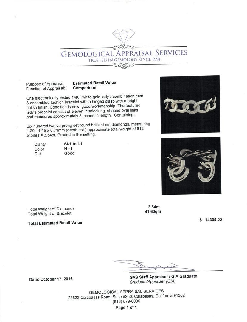 One electronically tested 14KT white gold lady's combination cast & assembled fashion bracelet with a hinged clasp with a bright polish finish. The featured lady's bracelet consist of eleven interlocking, shaped oval links and measures approximately 8 inches in length. Condition is new, good workmanship. Containing: Six Hundred Twelve prong set round brilliant cut diamonds, measuring 1.20 - 1.15 x 0.71mm (depth est.) approximate total weight of 612 Stones = 3.54ct. Graded in the setting. Clarity SI-1 to I-1. Color: H - I Cut Good. Total Weight of Diamonds 3.54ct.. Total Weight of Bracelet 41.60gm. GAS Appraised.