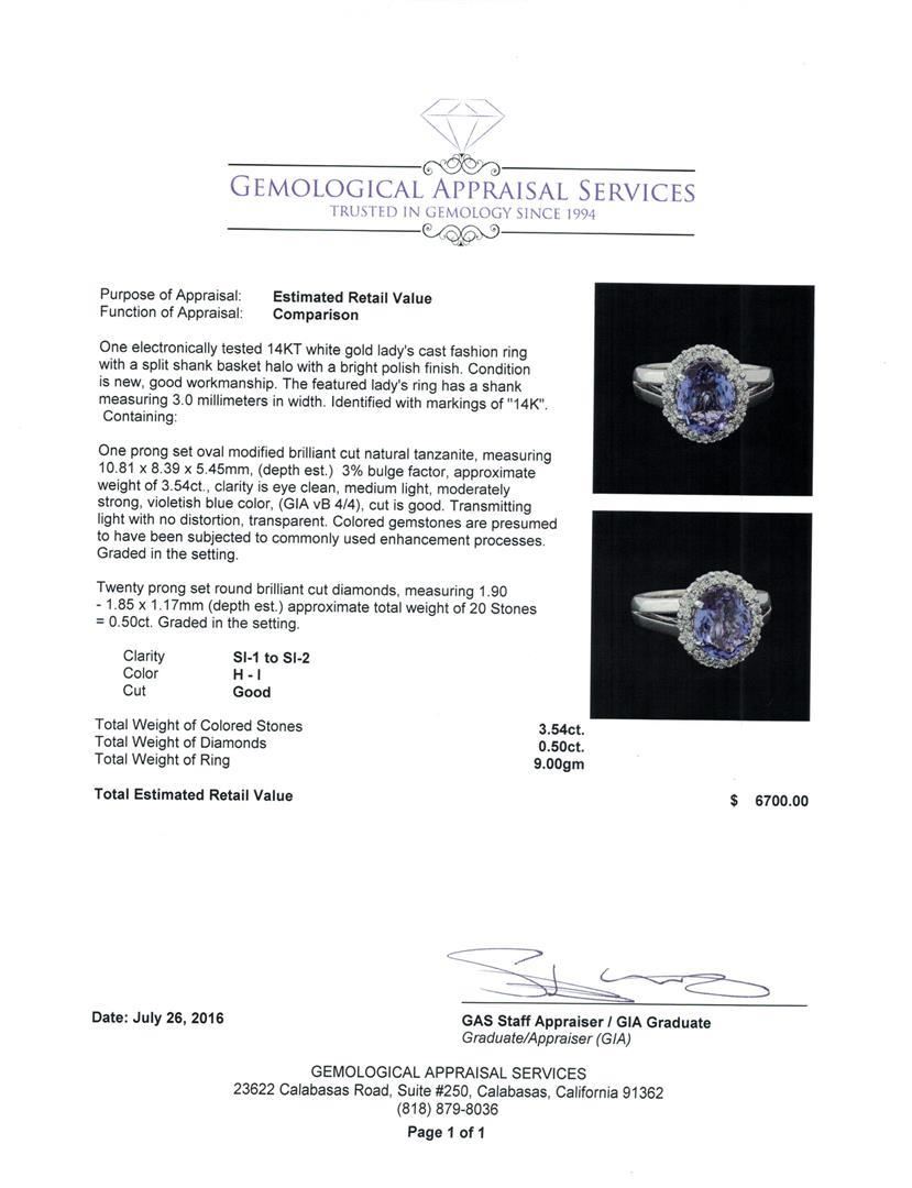 One electronically tested 14KT white gold lady's cast fashion ring with a split shank basket halo with a bright polish finish. The featured lady's ring has a shank measuring 3.0 millimeters in width. Identified with markings of '14K'. Condition is new, good workmanship. Containing: One prong set oval modified brilliant cut natural tanzanite, measuring 10.81 x 8.39 x 5.45mm, (depth est.) 3%. bulge factor, approximate weight of 3.54ct., clarity is eye clean, medium light, moderately strong, violetish blue color, (GIA vB 4/4), cut is good. Transmitting light with no distortion, transparent. Colored gemstones are presumed to have been subjected to commonly used enhancement processes. Graded in the setting. Twenty prong set round brilliant cut diamonds, measuring 1.90 - 1.85 x 1.17mm (depth est.) approximate total weight of 20 Stones = 0.50ct. Graded in the setting. Clarity SI-1 to SI-2. Color: H - I Cut Good. Total Weight of Colored Stones 3.54ct.. Total Weight of Diamonds 0.50ct.. Total Weight of Ring 9.00gm.