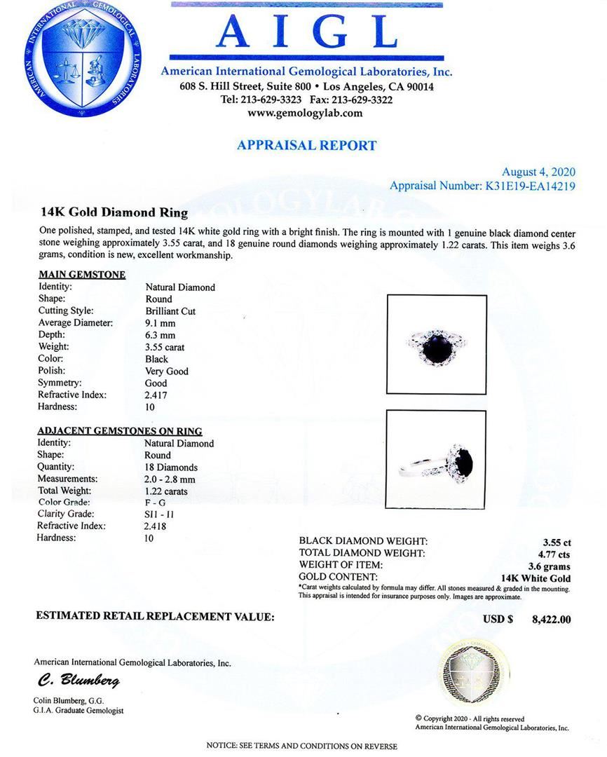 14K Gold Diamond Ring One polished, stamped, and tested 14K white gold ring with a bright finish. The ring is mounted with I genuine black diamond center stone weighing approximately 3.55 carat, and 18 genuine round diamonds weighing approximately 1.22 carats. This item weighs 3.6 grams, condition is new, excellent workmanship. MAIN GEMSTONE Identity: Natural Diamond Shape: Round Cutting Style: Brilliant Cut Average Diameter: 9.1mm Depth: 6.3mm Weight: 3.55 carat Color: Black Polish: Very Good Symmetry: Good Refractive Index: 2.417 Hardness: 10 ADJACENT GEMSTONES ON RING Identity: Natural Diamond Shape: Round Quantity: 18 Diamonds Measurements: 2.0 - 2.8mm Total Weight: 1.22 carats Color Grade: F - G Clarity Grade: SI1 to I1 Refractive Index: 2.418 Hardness: 10 BLACK DIAMOND WEIGHT: 3.55ct TOTAL DIAMOND WEIGHT: 4.77ctw WEIGHT OF ITEM: 3.6 grams GOLD CONTENT: 14K White Gold