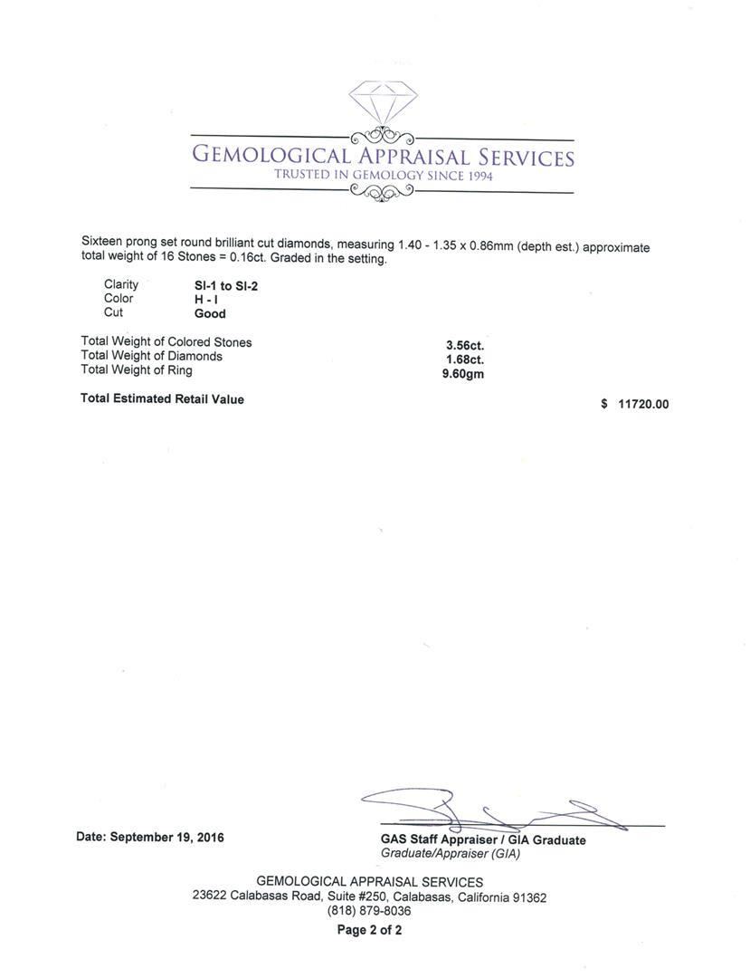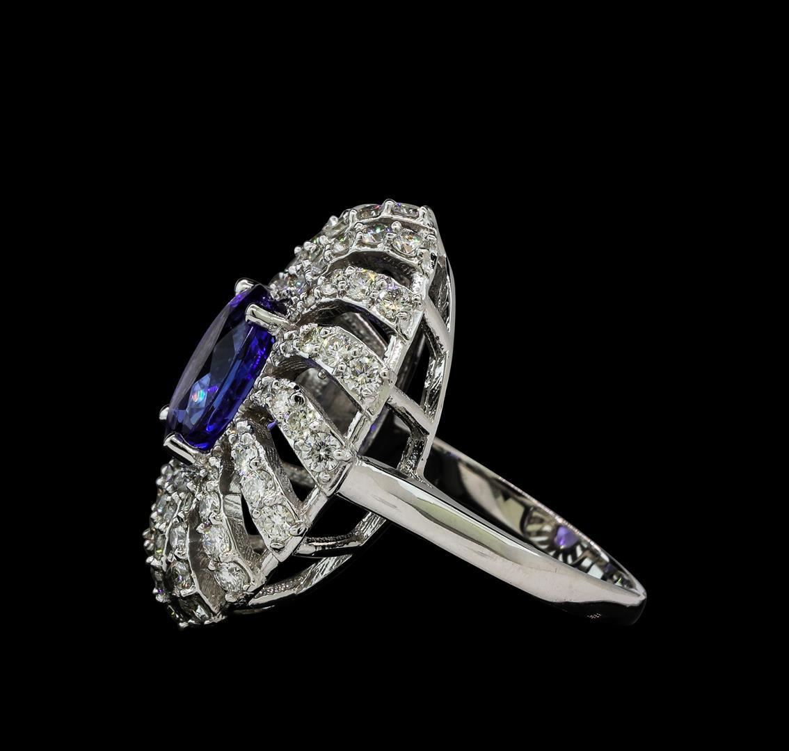 One electronically tested 14KT white gold lady's cast fashion ring with a spiral halo with a bright polish finish. The featured lady's ring has a shank measuring 2.16 millimeters wide. Identified with markings of 'K14'. Condition is new, good workmanship. Containing: One prong set oval modified brilliant cut natural tanzanite, measuring 10.38 x 8.49 x 5.58mm, (depth est.) approximate weight of 3.56ct., clarity is eye clean, medium dark, strong, violetish blue color, (GIA vB 6/5), cut is very good. Transmitting light with no distortion, transparent. Colored gemstones are presumed to have been subjected to commonly used enhancement processes. Graded in the setting. Thirty-Two prong set round brilliant cut diamonds, measuring 2.10 - 1.90 x 1.24mm (depth est.) approximate total weight of 32 Stones = 0.99ct. Graded in the setting. Clarity SI-1 to SI-2. Color: H - I Cut Good Sixteen prong set round brilliant cut diamonds, measuring 1.80 - 1.70 x 1.05mm (depth est.) approximate total weight of 16 Stones = 0.31ct. Graded in the setting. Clarity SI-1 to I-1. Color: H - I Cut Good Sixteen prong set round brilliant cut diamonds, measuring 1.60 - 1.50 x 0.93mm (depth est.) approximate total weight of 16 Stones = 0.22ct. Graded in the setting. Clarity SI-1 to I-1. Color: H - I Cut Good Sixteen prong set round brilliant cut diamonds, measuring 1.40 - 1.35 x 0.86mm (depth est.) approximate total weight of 16 Stones = 0.16ct. Graded in the setting. Clarity SI-1 to SI-2. Color: H - I Cut Good. Total Weight of Colored Stones 3.56ct.. Total Weight of Diamonds 1.68ct.. Total Weight of Ring 9.60gm. GAS Appraised.