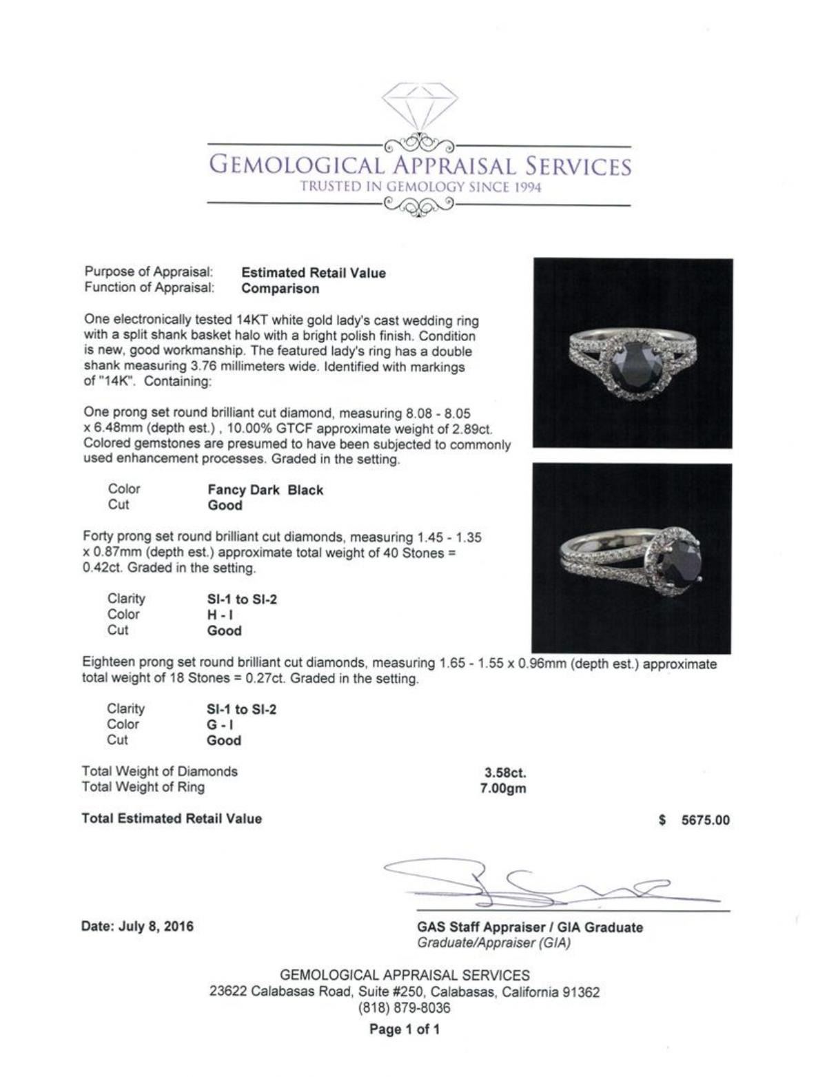 One electronically tested 14KT white gold lady's cast wedding ring with a split shank basket halo with a bright polish finish. The featured lady's ring has a double shank measuring 3.76 millimeters wide. Identified with markings of "14K". Condition is new, good workmanship. Containing: One prong set round brilliant cut diamond, measuring 8.08 - 8.05 x 6.48mm (depth est.) , 10.00.%. GTCF approximate weight of 2.89ct. Colored gemstones are presumed to have been subjected to commonly used enhancement processes. Graded in the setting. Cut Good Forty prong set round brilliant cut diamonds, measuring 1.45 - 1.35 x 0.87mm (depth est.) approximate total weight of 40 Stones = 0.42ct. Graded in the setting. Clarity: SI-1 to SI-2. Color: H - I. Cut Good Eighteen prong set round brilliant cut diamonds, measuring 1.65 - 1.55 x 0.96mm (depth est.) approximate total weight of 18 Stones = 0.27ct. Graded in the setting. Clarity: SI-1 to SI-2. Color: G - I. Cut Good. Total Weight of Diamonds 3.58ct. Total Weight of Ring 7.00gm. GAS Appraised.