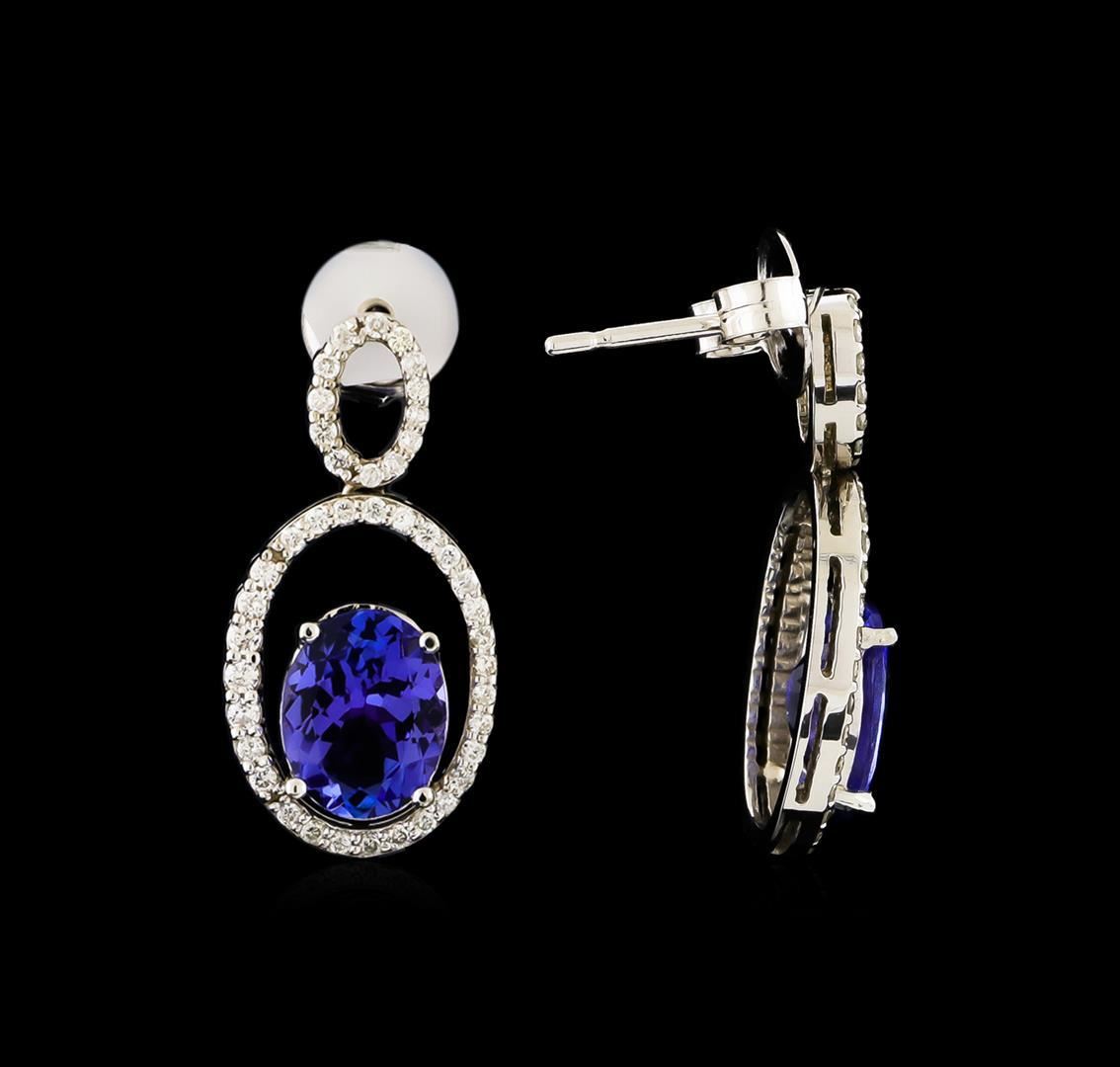 One pair electronically tested 14KT white gold lady's combination cast & assembled dangle earrings with friction posts with a bright polish finish. The featured pair of lady's earrings has a drop of approximately 25 millimeters. Identified with markings of "14K". Condition is new, good workmanship. Containing: Two prong set oval modified brilliant cut natural tanzanites, measuring 9.40 x 7.48 x 3.87mm, approximate total weight of 3.58ct., clarity is eye clean, medium light, very slightly grayish, violetish blue color, (GIA vB 4/3), cut is very good. Transmitting light with no distortion, transparent. Colored gemstones are presumed to have been subjected to commonly used enhancement processes. Graded in the setting. Eight prong set round brilliant cut diamonds, measuring 1.40 - 1.35 x 0.86mm (depth est.) approximate total weight of 8 Stones = 0.08ct. Graded in the setting. Clarity: SI-1 to SI-2. Color: G - Very Good Eighty prong set round brilliant cut diamonds, measuring 1.25 - 1.15 x 0.74mm (depth est.) approximate total weight of 80 Stones = 0.54ct. Graded in the setting. Clarity: SI-1 to I-1. Color: H - I. Cut Good. Total Weight of Colored Stones 3.58ct. Total Weight of Diamonds 0.62ct. Total Weight of Earrings 5.00gm.