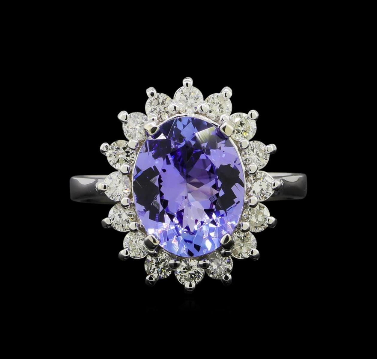 One electronically tested 14KT white gold lady's cast fashion ring with a basket halo with a bright polish finish. The featured lady's ring has a shank measuring 2.44 millimeters wide. Identified with markings of 'K14'. Condition is new, good workmanship. Containing: One prong set oval modified brilliant cut natural tanzanite, measuring 11.27 x 8.96 x 5.13mm, (depth est.) approximate weight of 3.58ct., clarity is eye clean, medium light, moderately strong, bluish violet color, (GIA bV 4/4), cut is good. Transmitting light with no distortion, transparent. Colored gemstones are presumed to have been subjected to commonly used enhancement processes. Graded in the setting. Sixteen prong set round brilliant cut diamonds, measuring 2.40 - 2.30 x 1.41mm (depth est.) approximate total weight of 16 Stones = 0.76ct. Graded in the setting. Clarity SI-1 to SI-2. Color: H - I Cut Good. Total Weight of Colored Stones 3.58ct.. Total Weight of Diamonds 0.76ct.. Total Weight of Ring 5.20gm.