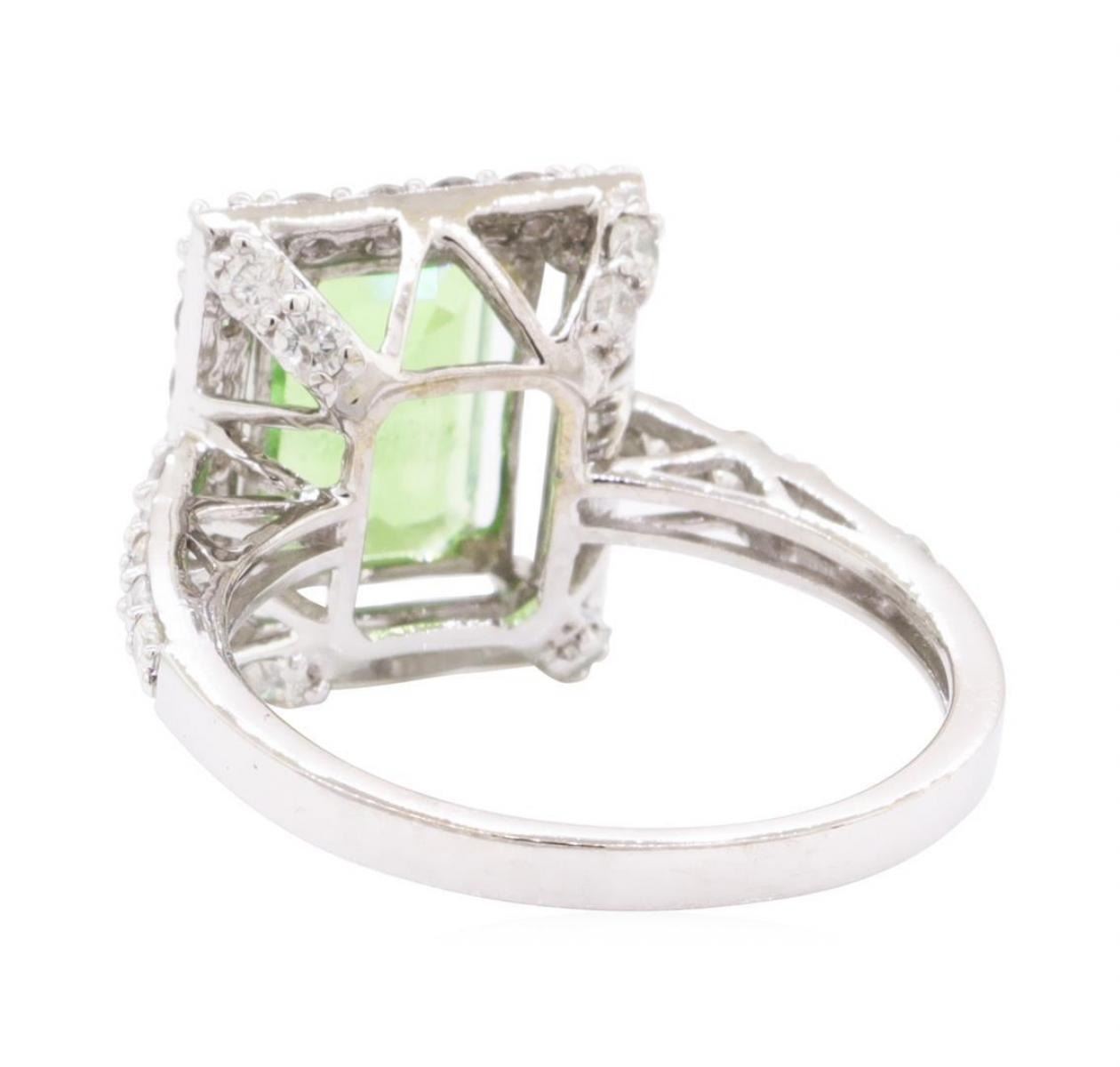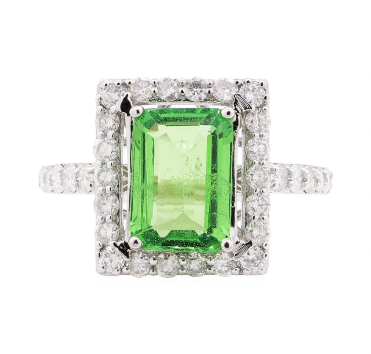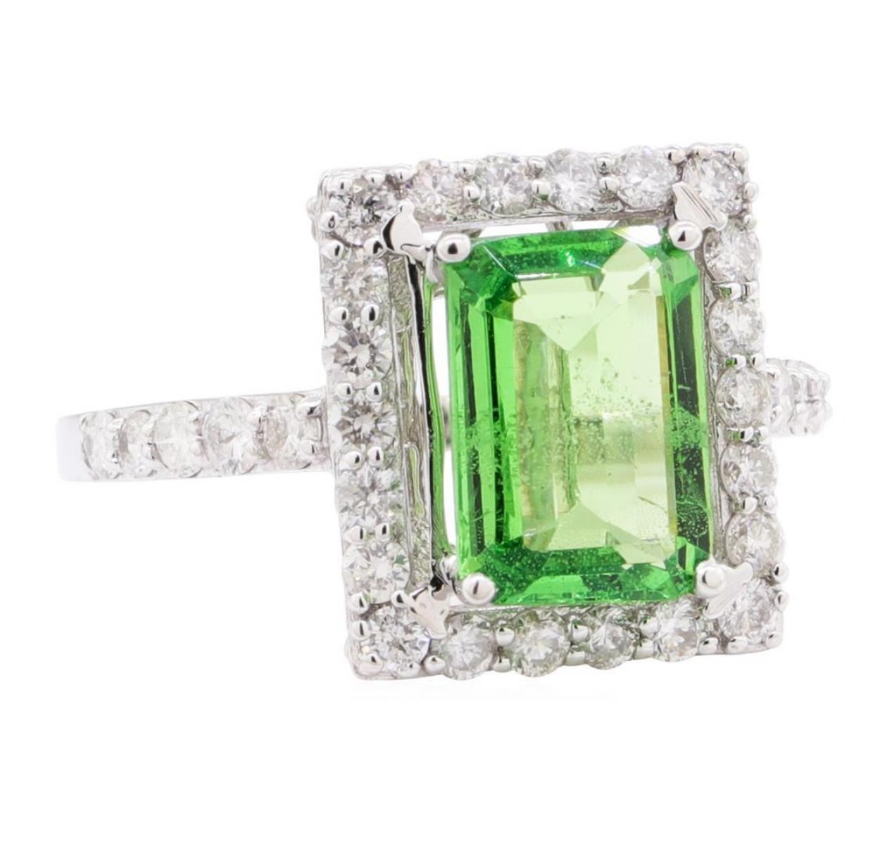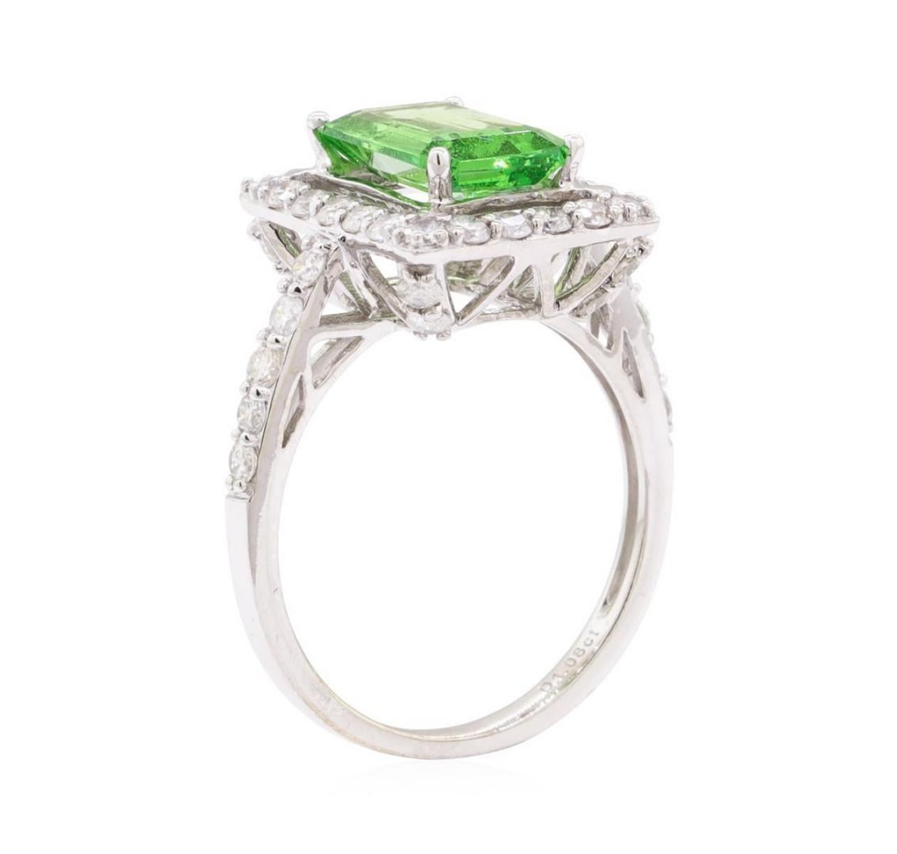 One electronically tested 14KT white gold lady's cast fashion ring with a basket halo with a bright polish finish. The featured lady's ring has a shank measuring 1.90 millimeters wide. Trademark is Orianne. Identified with markings of '14K'. Condition is new, good workmanship. Containing: One prong set emerald standard step cut natural tsavorite garnet, measuring 9.90 x 6.95 x 3.33mm, (depth est.) 5%. bulge factor, approximate weight of 2.50ct., clarity is slightly included, medium light, moderately strong, green color, (GIA G 4/4), cut is very good. Transmitting light with a minimum of distortion, transparent. Colored gemstones are presumed to have been subjected to commonly used enhancement processes. Graded in the setting. Forty prong set round brilliant cut diamonds, measuring 2.00 - 1.90 x 1.17mm (depth est.) approximate total weight of 40 Stones = 1.08ct. Graded in the setting. Color H - I Clarity SI-2 to I-1 Cut Good. Total Weight of Colored Stones 2.50ct.. Total Weight of Diamonds 1.08ct.. Total Weight of Ring 4.00gm GAS Appraised at $7005.00. GAS Appraised.