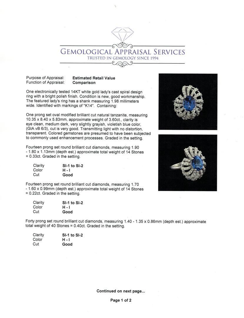 One electronically tested 14KT white gold lady's cast spiral design ring with a bright polish finish. The featured lady's ring has a shank measuring 1.98 millimeters wide. Identified with markings of "K14". Condition is new, good workmanship. Containing: One prong set oval modified brilliant cut natural tanzanite, measuring 10.35 x 8.40 x 5.83mm, approximate weight of 3.60ct., clarity is eye clean, medium dark, very slightly grayish, violetish blue color, (GIA vB 6/3), cut is very good. Transmitting light with no distortion, transparent. Colored gemstones are presumed to have been subjected to commonly used enhancement processes. Graded in the setting. Fourteen prong set round brilliant cut diamonds, measuring 1.90 - 1.80 x 1.13mm (depth est.) approximate total weight of 14 Stones = 0.33ct. Graded in the setting. Clarity: SI-1 to SI-2. Color: H - I. Cut Good Fourteen prong set round brilliant cut diamonds, measuring 1.70 - 1.60 x 0.99mm (depth est.) approximate total weight of 14 Stones = 0.22ct. Graded in the setting. Clarity: SI-1 to SI-2. Color: H - I. Cut Good Forty prong set round brilliant cut diamonds, measuring 1.40 - 1.35 x 0.86mm (depth est.) approximate total weight of 40 Stones = 0.40ct. Graded in the setting. Clarity: SI-1 to SI-2. Color: H - I. Cut Good. Total Weight of Colored Stones 3.60ct. Total Weight of Diamonds 0.95ct. Total Weight of Ring 7.80gm. GAS Appraised.