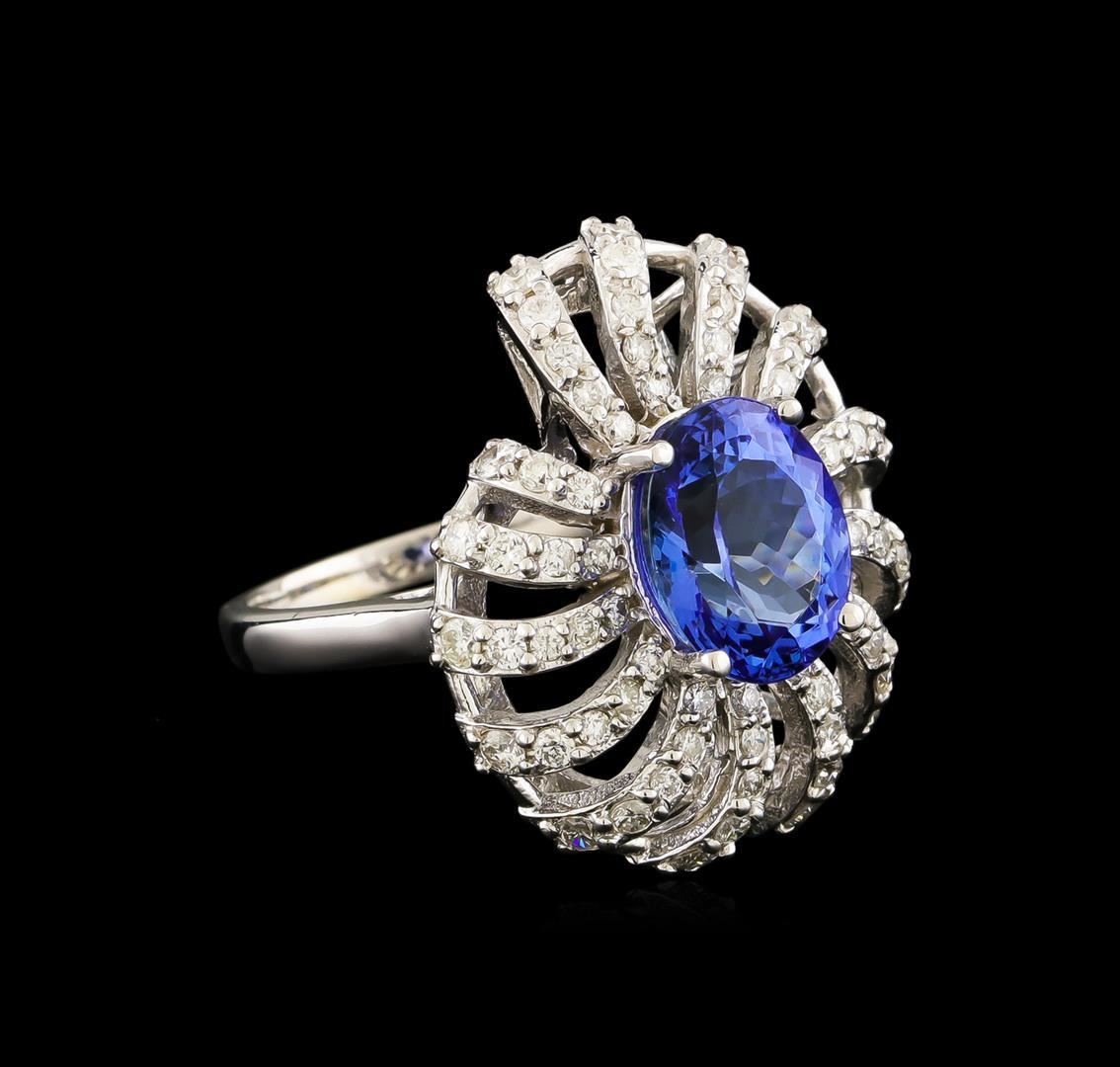 One electronically tested 14KT white gold lady's cast spiral design ring with a bright polish finish. The featured lady's ring has a shank measuring 1.98 millimeters wide. Identified with markings of "K14". Condition is new, good workmanship. Containing: One prong set oval modified brilliant cut natural tanzanite, measuring 10.35 x 8.40 x 5.83mm, approximate weight of 3.60 ct., clarity is eye clean, medium dark, very slightly grayish, violetish blue color, (GIA vB 6/3), cut is very good. Transmitting light with no distortion, transparent. Colored gemstones are presumed to have been subjected to commonly used enhancement processes. Graded in the setting. Fourteen prong set round brilliant cut diamonds, measuring 1.90 - 1.80 x 1.13mm (depth est.) approximate total weight of 14 Stones = 0.33ct. Graded in the setting. Clarity: SI-1 to SI-2. Color: H - I. Cut Good Fourteen prong set round brilliant cut diamonds, measuring 1.70 - 1.60 x 0.99mm (depth est.) approximate total weight of 14 Stones = 0.22ct. Graded in the setting. Clarity: SI-1 to SI-2. Color: H - I. Cut Good Forty prong set round brilliant cut diamonds, measuring 1.40 - 1.35 x 0.86mm (depth est.) approximate total weight of 40 Stones = 0.40 ct. Graded in the setting. Clarity: SI-1 to SI-2. Color: H - I. Cut Good. Total Weight of Colored Stones 3.60 ct. Total Weight of Diamonds 0.95ct. Total Weight of Ring 7.80gm. GAS Appraised.