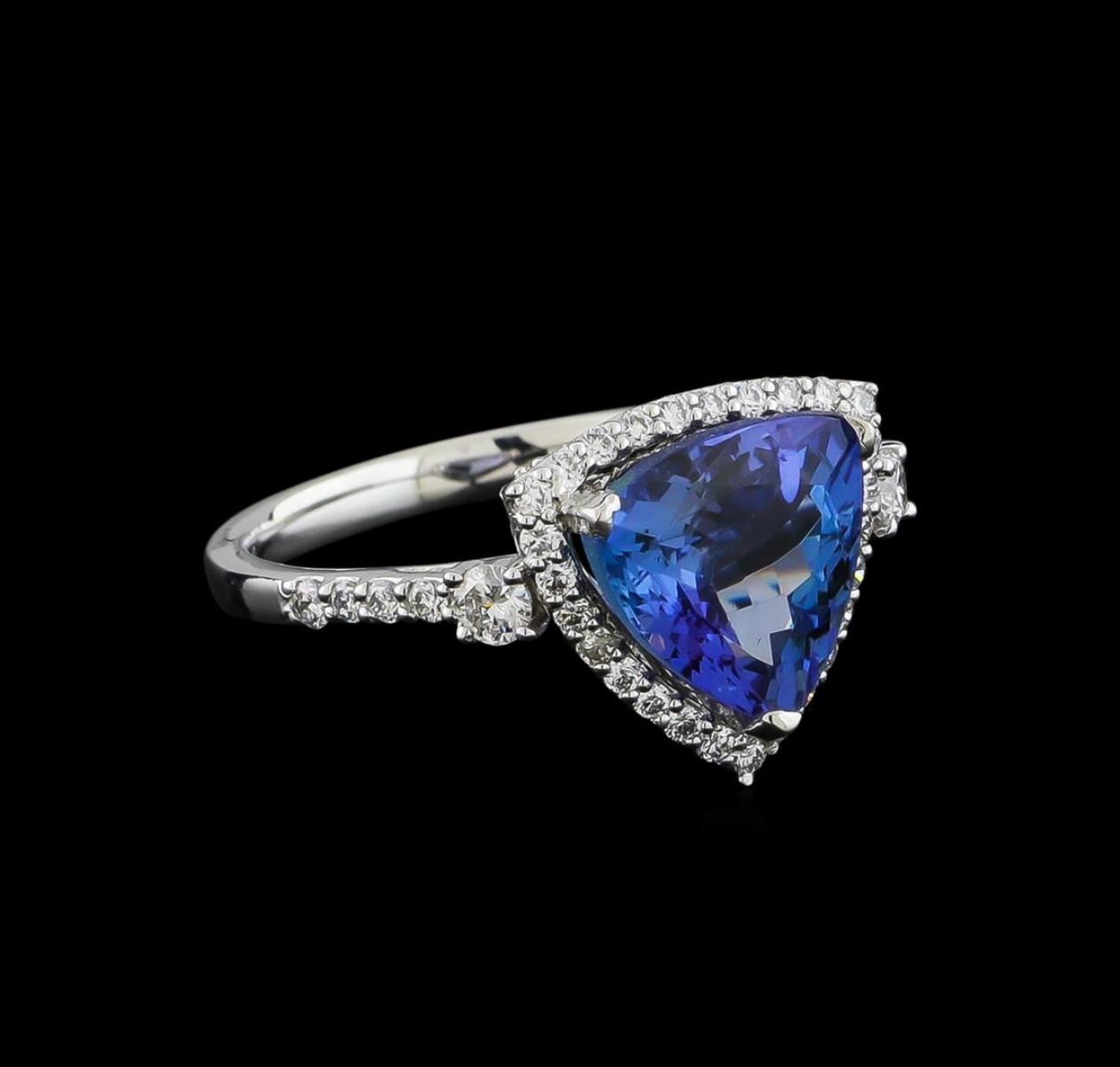 One electronically tested platinum ladies cast tanzanite and diamond ring with a bright polish finish. The featured tanzanite is set within a diamond bezel supported by a diamond set under gallery and diamond set shoulders, completed by a two millimeter wide band. Trademark is Orianne. Identified with markings of "PT950". Condition is new, good workmanship. Containing: One prong set triangle mixed cut natural tanzanite, measuring 9.70 x 10.00 x 5.65mm, 6%. bulge factor, approximate weight of 3.60ct., clarity is eye clean, type I, medium dark, slightly grayish, bluish violet color, (GIA bV 6/2), cut is good. Transmitting light with no distortion, transparent. Graded in the setting. Tanzanite is a very rare gemstone that is only found in the country of Tanzania. Originally discovered in 1967. Tiffany & Company, named the stone Tanzanite. It is found in the Usumburu Mountains that border the Umba Valley of northern Tanzania. Tanzanite occurs in gray, brown, violet, blue, reddish-purple, & green. The gem is interesting because of its exceptional pleochroism. Rotated in different directions a tanzanite will exhibit multiple changes of color. Tanzanite has a low tolerance to ultrasonic cleaning, and should not be cleaned using this method. Fifty-Three prong set round brilliant cut diamonds approximate total weight of 53 Stones = 0.57ct. Graded in the setting. Clarity: VS-1 to VS-2. Color: D - F. Total Weight of Colored Stones 3.60ct. Total Weight of Diamonds 0.57ct. Total Weight of Ring 5.40gm.