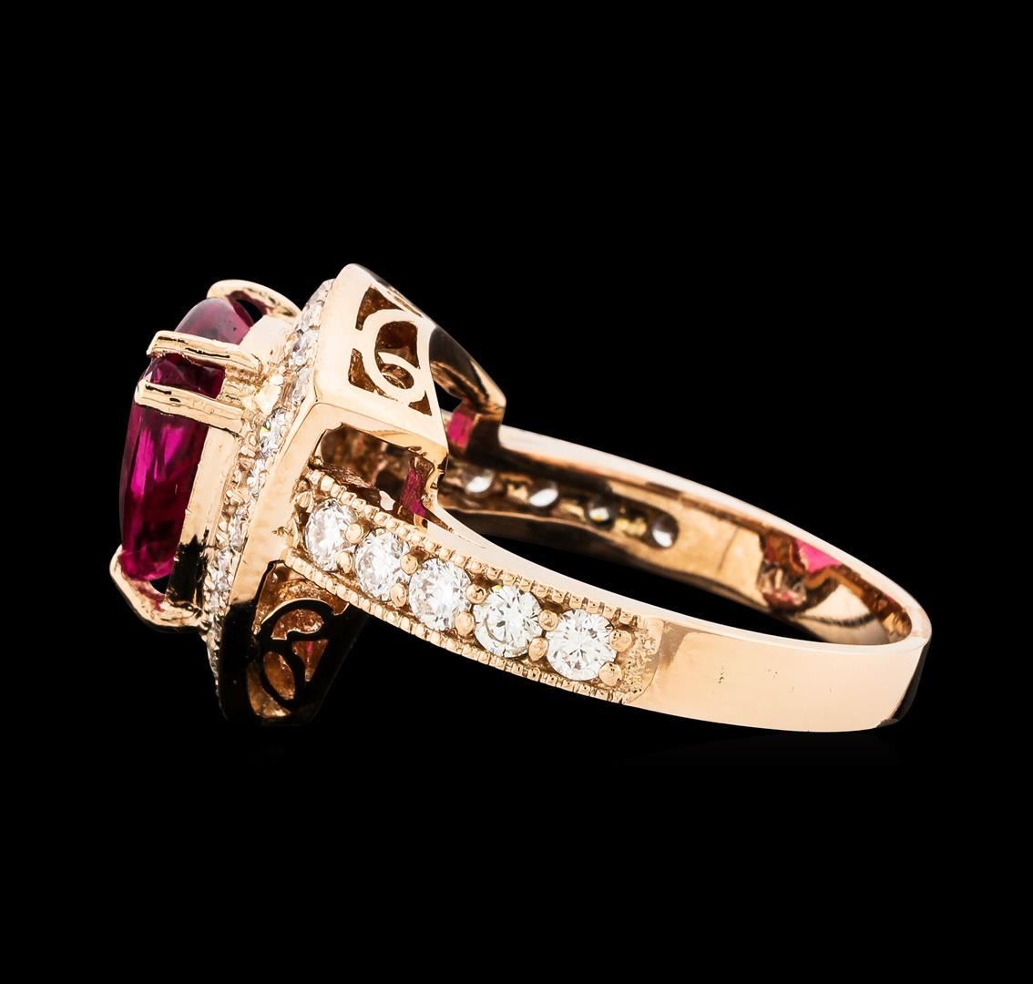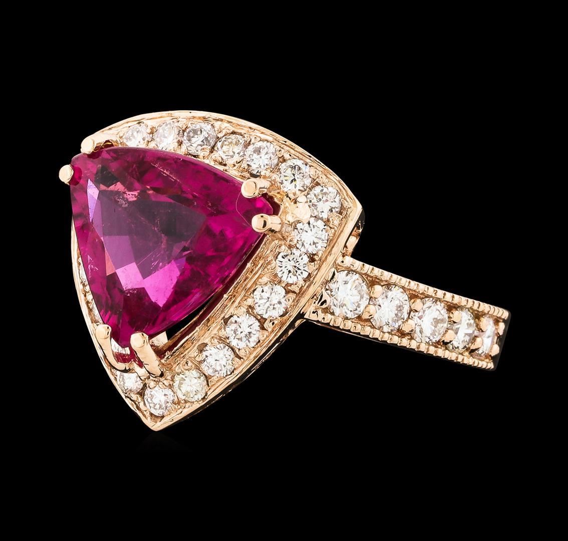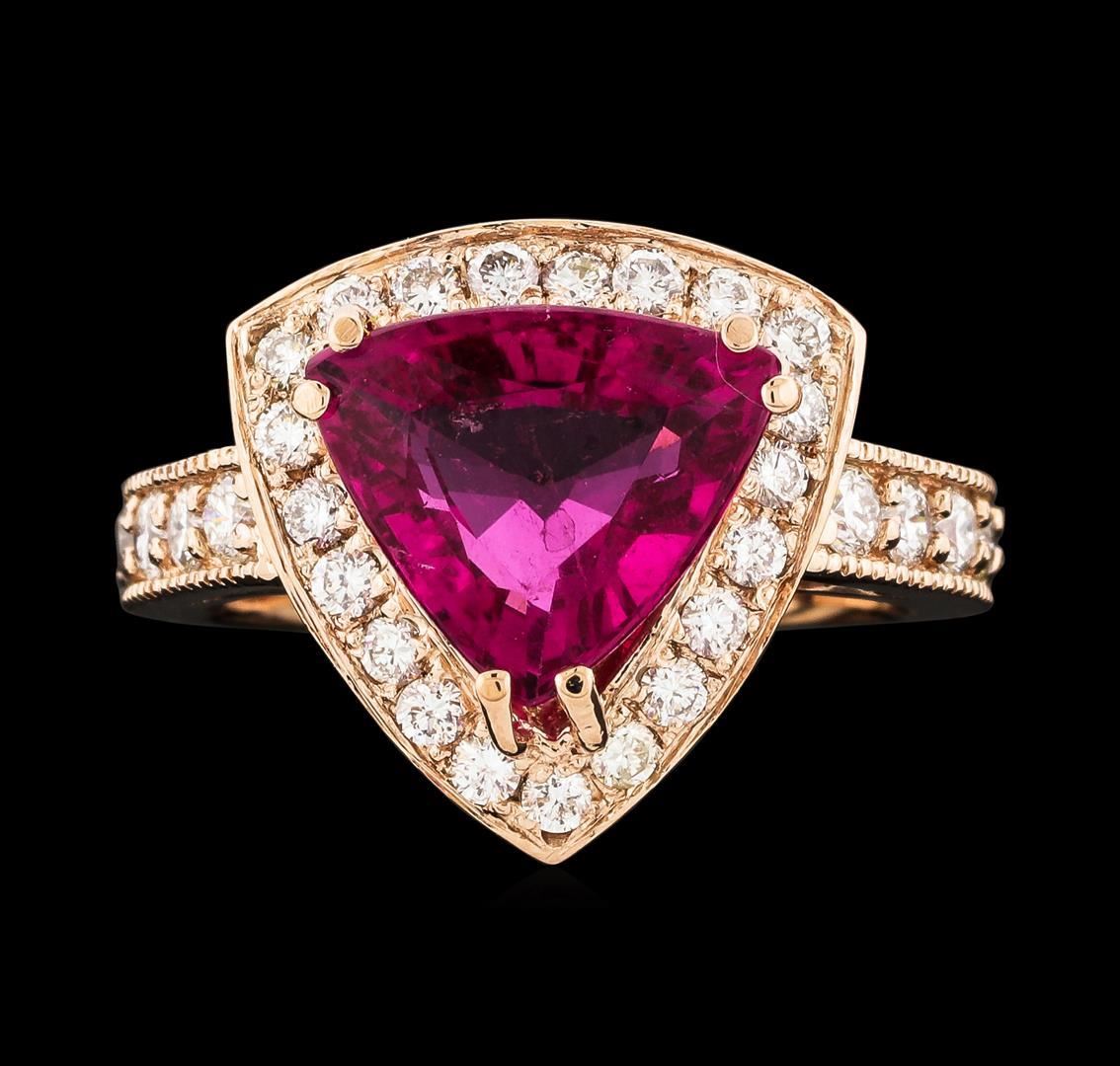 One electronically tested 14KT rose gold lady's cast fashion ring with a cathedral halo with a bright polish with milgrain detailing finish. The featured lady's ring has a shank measuring 2.73 millimeters wide. Identified with markings of 'K14'. Condition is new, good workmanship. Containing: One prong set triangle modified brilliant cut natural pink tourmaline, measuring 11.50 x 10.30 x 5.44mm, (depth est.) approximate weight of 3.61ct., clarity is slightly included, medium, strong, strongly purplish red color, (GIA stpR 5/5), cut is very good. Transmitting light with a minimum of distortion, transparent. Colored gemstones are presumed to have been subjected to commonly used enhancement processes. Graded in the setting. Ten prong set round brilliant cut diamonds, measuring 2.40 - 2.35 x 1.48mm (depth est.) approximate total weight of 10 Stones = 0.51ct. Graded in the setting. Clarity SI-1 to SI-2. Color: H - I Cut Good Twenty-One prong set round brilliant cut diamonds, measuring 1.85 - 1.75 x 1.12mm (depth est.) approximate total weight of 21 Stones = 0.46ct. Graded in the setting. Clarity SI-1 to SI-2. Color: H - I Cut Good. Total Weight of Colored Stones 3.61ct.. Total Weight of Diamonds 0.97ct.. Total Weight of Ring 6.70gm. GAS Appraised.