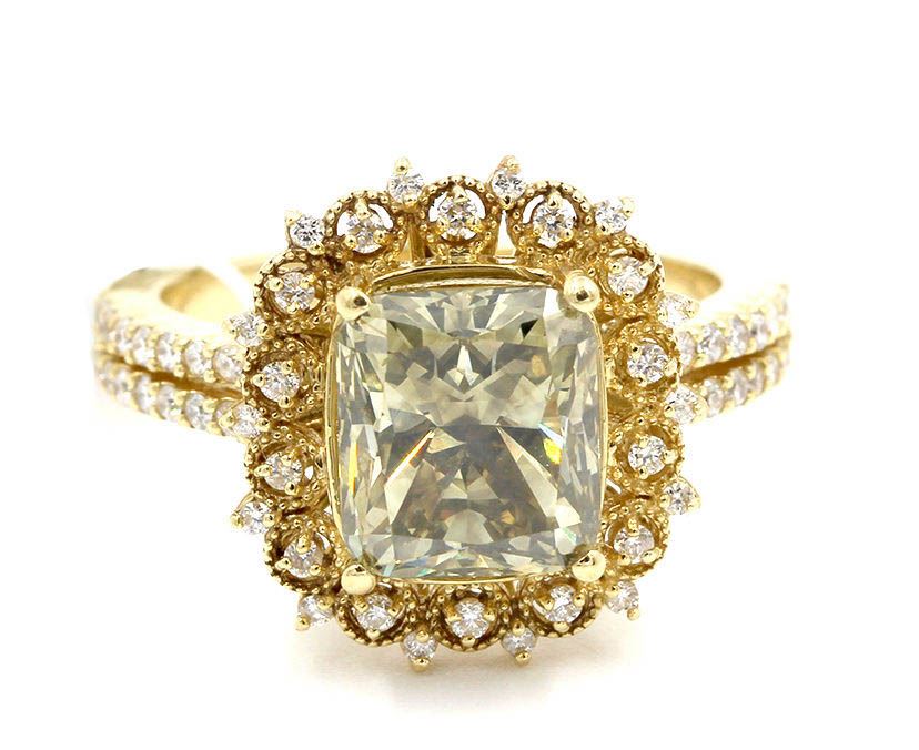 One lady's ring featuring: 14KT yellow gold weighing 5.38 grams containing one green diamond weighing 3.62ct and 56 white diamonds weighing 0.36ctw. The green diamond is cushion shaped with an excellent cut, SI-1 clarity and fancy light green color. The s