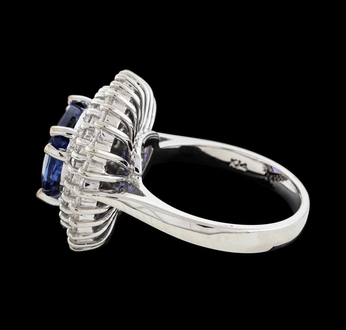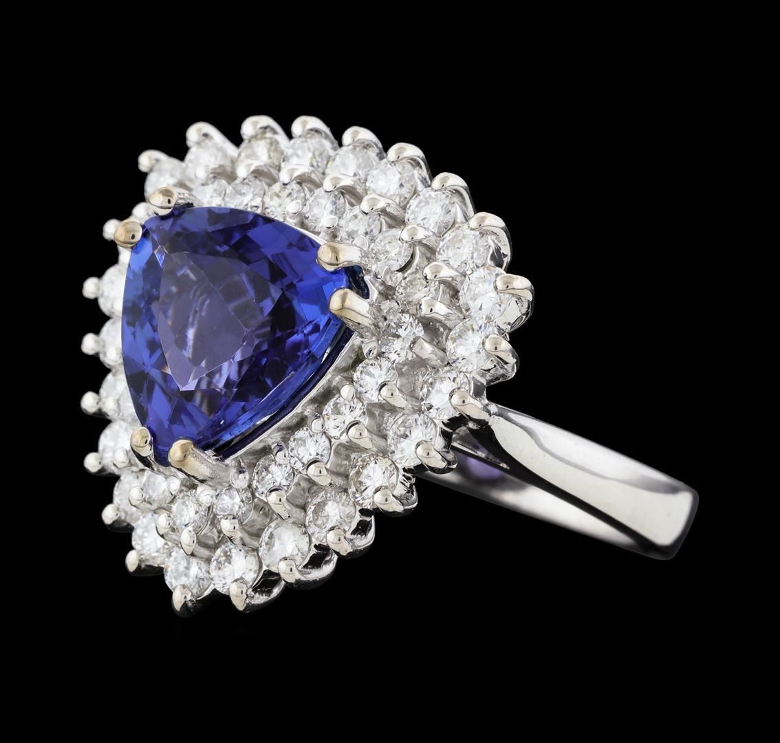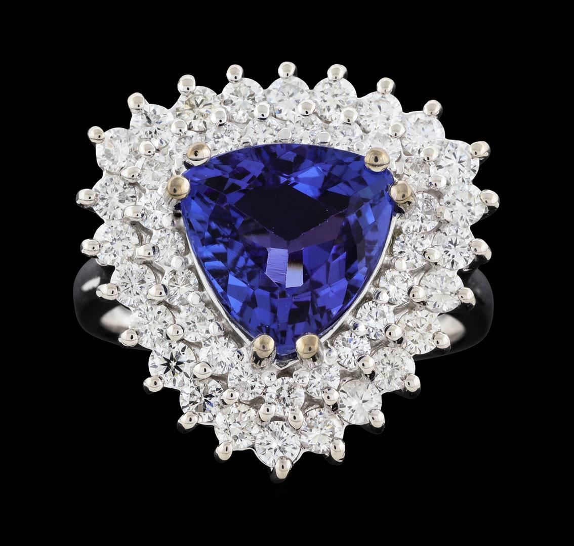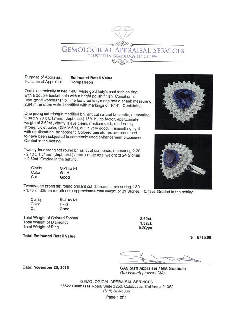 One electronically tested 14KT white gold lady's cast fashion ring with a double basket halo with a bright polish finish. The featured lady's ring has a shank measuring 2.84 millimeters wide. Identified with markings of 'K14'. Condition is new, good workmanship. Containing: One prong set triangle modified brilliant cut natural tanzanite, measuring 9.84 x 9.70 x 5.18mm, (depth est.) 15%. bulge factor, approximate weight of 3.62ct., clarity is eye clean, medium dark, moderately strong, violet color, (GIA V 6/4), cut is very good. Transmitting light with no distortion, transparent. Colored gemstones are presumed to have been subjected to commonly used enhancement processes. Graded in the setting. Twenty-Four prong set round brilliant cut diamonds, measuring 2.20 - 2.10 x 1.31mm (depth est.) approximate total weight of 24 Stones = 0.89ct. Graded in the setting. Clarity SI-1 to I-1. Color: G - H Cut Good Twenty-One prong set round brilliant cut diamonds, measuring 1.80 - 1.70 x 1.09mm (depth est.) approximate total weight of 21 Stones = 0.43ct. Graded in the setting. Clarity SI-1 to I-1. Color: F - G Cut Good. Total Weight of Colored Stones 3.62ct.. Total Weight of Diamonds 1.32ct.. Total Weight of Ring 9.20gm. GAS Appraised.