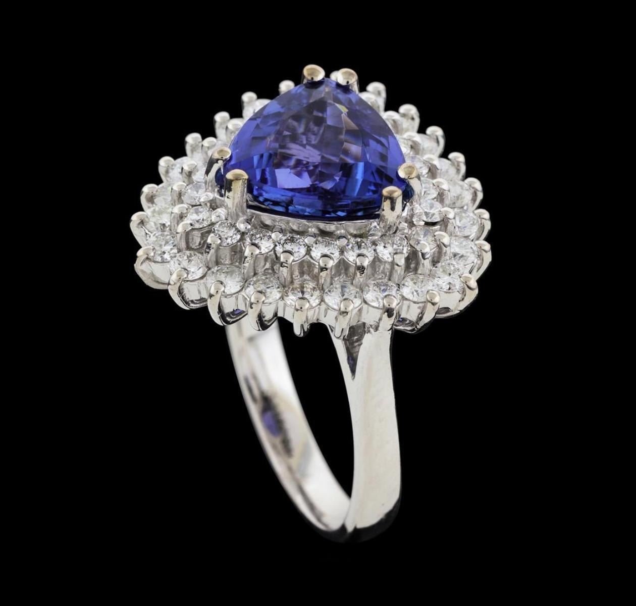 One electronically tested 14KT white gold lady's cast fashion ring with a double basket halo with a bright polish finish. The featured lady's ring has a shank measuring 2.84 millimeters wide. Identified with markings of 'K14'. Condition is new, good workmanship. Containing: One prong set triangle modified brilliant cut natural tanzanite, measuring 9.84 x 9.70 x 5.18mm, (depth est.) 15%. bulge factor, approximate weight of 3.62ct., clarity is eye clean, medium dark, moderately strong, violet color, (GIA V 6/4), cut is very good. Transmitting light with no distortion, transparent. Colored gemstones are presumed to have been subjected to commonly used enhancement processes. Graded in the setting. Twenty-Four prong set round brilliant cut diamonds, measuring 2.20 - 2.10 x 1.31mm (depth est.) approximate total weight of 24 Stones = 0.89ct. Graded in the setting. Clarity SI-1 to I-1. Color: G - H Cut Good Twenty-One prong set round brilliant cut diamonds, measuring 1.80 - 1.70 x 1.09mm (depth est.) approximate total weight of 21 Stones = 0.43ct. Graded in the setting. Clarity SI-1 to I-1. Color: F - G Cut Good. Total Weight of Colored Stones 3.62ct.. Total Weight of Diamonds 1.32ct.. Total Weight of Ring 9.20gm. GAS Appraised.
