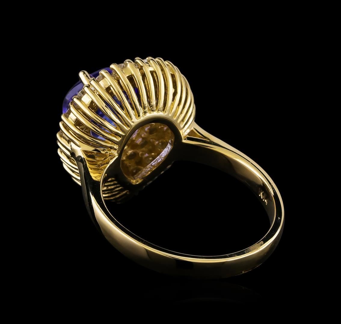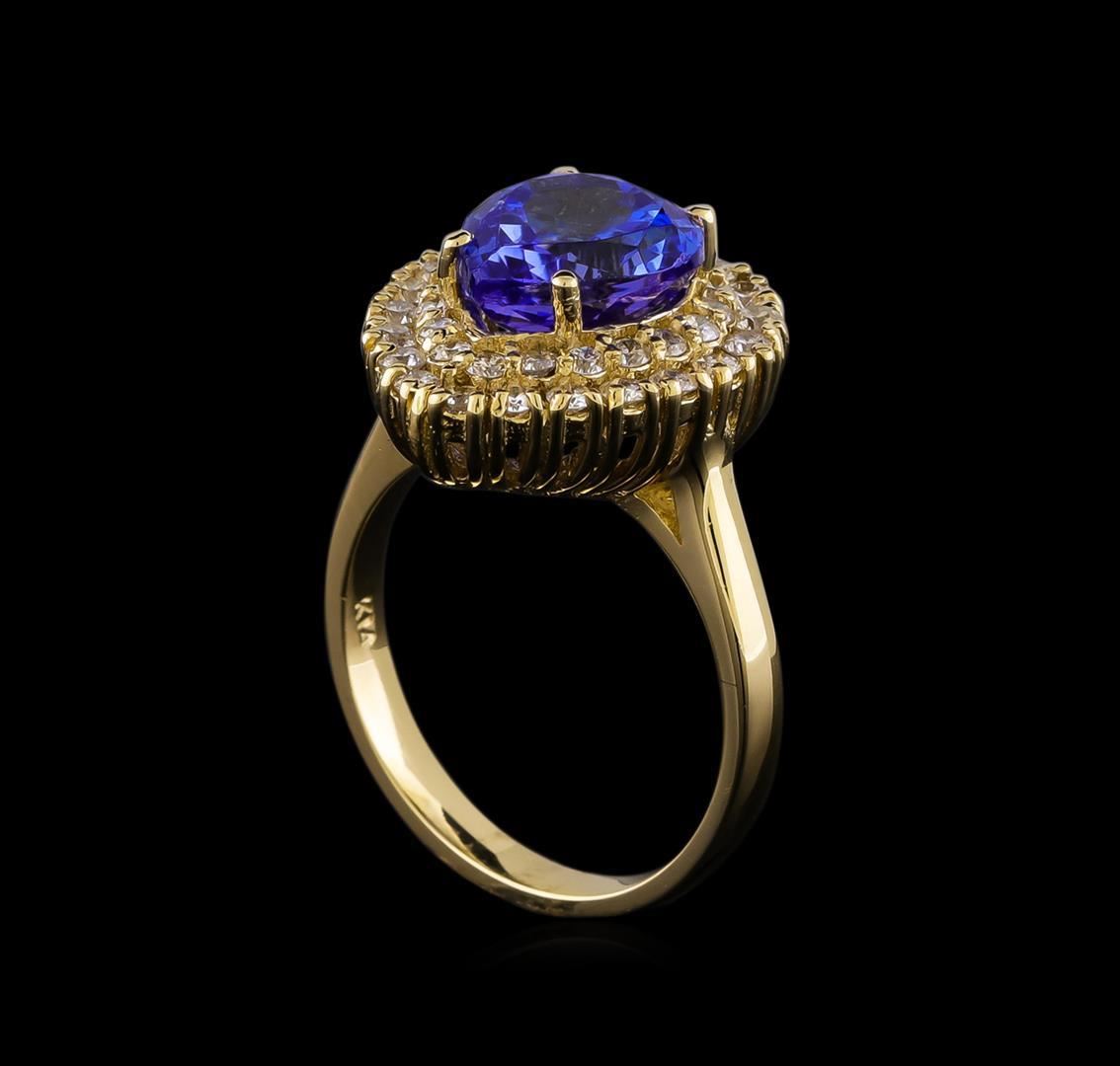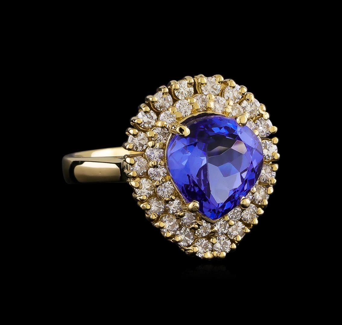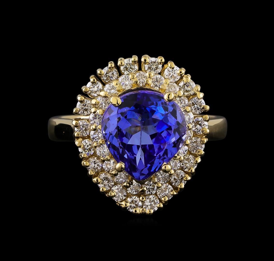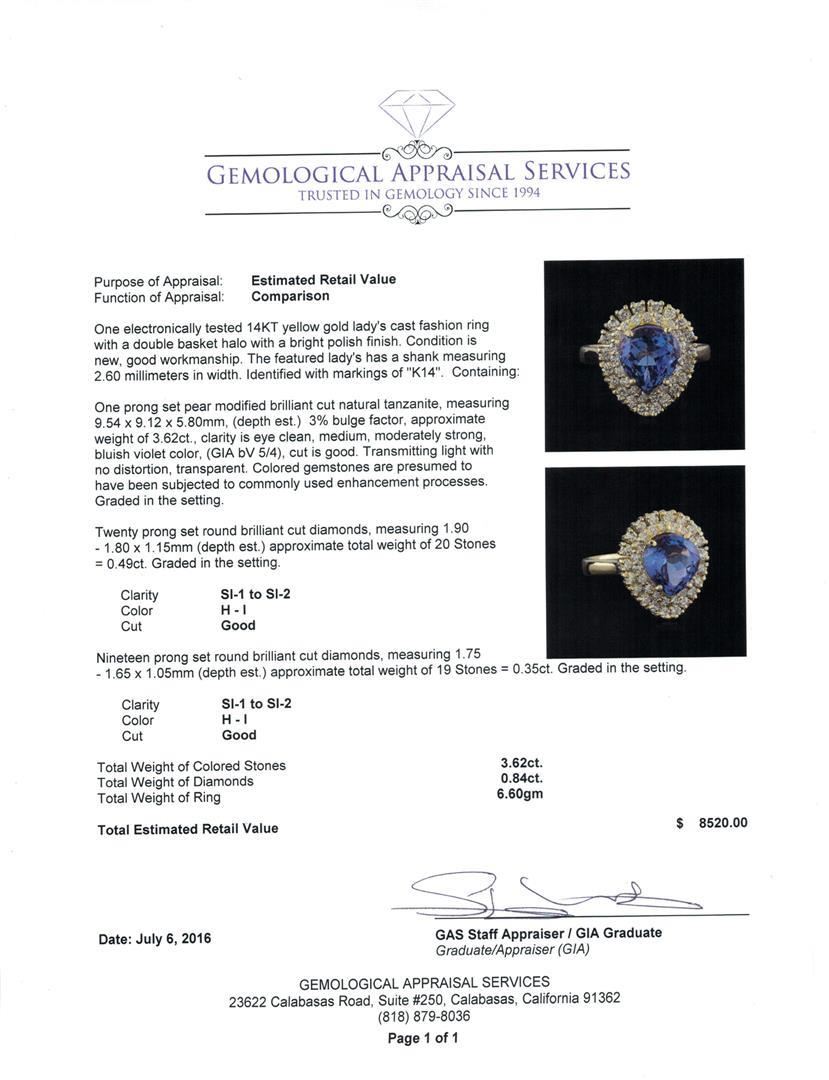 One electronically tested 14KT yellow gold lady's cast fashion ring with a double basket halo with a bright polish finish. The featured lady's has a shank measuring 2.60 millimeters in width. Identified with markings of "K14". Condition is new, good workmanship. Containing: One prong set pear modified brilliant cut natural tanzanite, measuring 9.54 x 9.12 x 5.80mm, (depth est.) 3%. bulge factor, approximate weight of 3.62ct., clarity is eye clean, medium, moderately strong, bluish violet color, (GIA bV 5/4), cut is good. Transmitting light with no distortion, transparent. Colored gemstones are presumed to have been subjected to commonly used enhancement processes. Graded in the setting. Twenty prong set round brilliant cut diamonds, measuring 1.90 - 1.80 x 1.15mm (depth est.) approximate total weight of 20 Stones = 0.49ct. Graded in the setting. Clarity: SI-1 to SI-2. Color: H - I. Cut Good Nineteen prong set round brilliant cut diamonds, measuring 1.75 - 1.65 x 1.05mm (depth est.) approximate total weight of 19 Stones = 0.35ct. Graded in the setting. Clarity: SI-1 to SI-2. Color: H - I. Cut Good. Total Weight of Colored Stones 3.62ct. Total Weight of Diamonds 0.84ct. Total Weight of Ring 6.60gm.