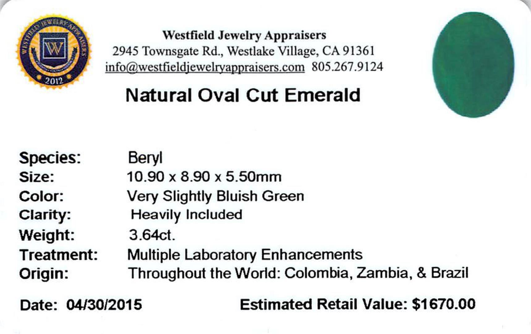 One oval cut natural emerald, measuring 10.90 x 3.90 x 5.50mm, exact weight 3.64ct., clarity is heavily included, type III, medium, very slightly grayish, very slightly bluish green color, (GIA vslbG 5/3), cut is good. Westfield Appraised.
