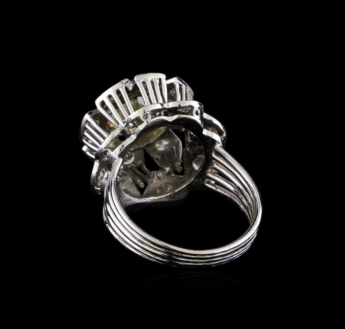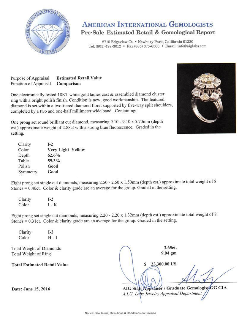 One electronically tested 18KT white gold ladies cast & assembled diamond cluster ring with a bright polish finish. The featured diamond is set within a two-tiered diamond floret supported by five-way split shoulders, completed by a two and one-half millimeter wide band. Condition is new, good workmanship. Containing: One prong set round brilliant cut diamond, measuring 9.10 - 9.10 x 5.70mm (depth est.) approximate weight of 2.88ct with a strong blue fluorescence. Graded in the setting. Clarity: I-2. Depth: 62.6%. Table 59.3%. Eight prong set single cut diamonds, measuring 2.50 - 2.50 x 1.50mm (depth est.) approximate total weight of 8 Stones = 0.46ct. Color & clarity grade are an average for the group. Graded in the setting. Clarity: I-2. Color: I - K Eight prong set single cut diamonds, measuring 2.20 - 2.20 x 1.32mm (depth est.) approximate total weight of 8 Stones = 0.31ct. Color & clarity grade are an average for the group. Graded in the setting. Clarity: I-2. Color: H - I. Total Weight of Diamonds 3.65ct. Total Weight of Ring 9.04gm. AIG Appraised.