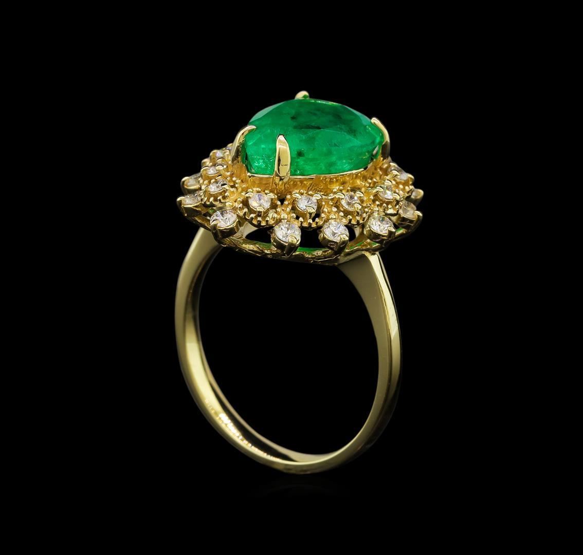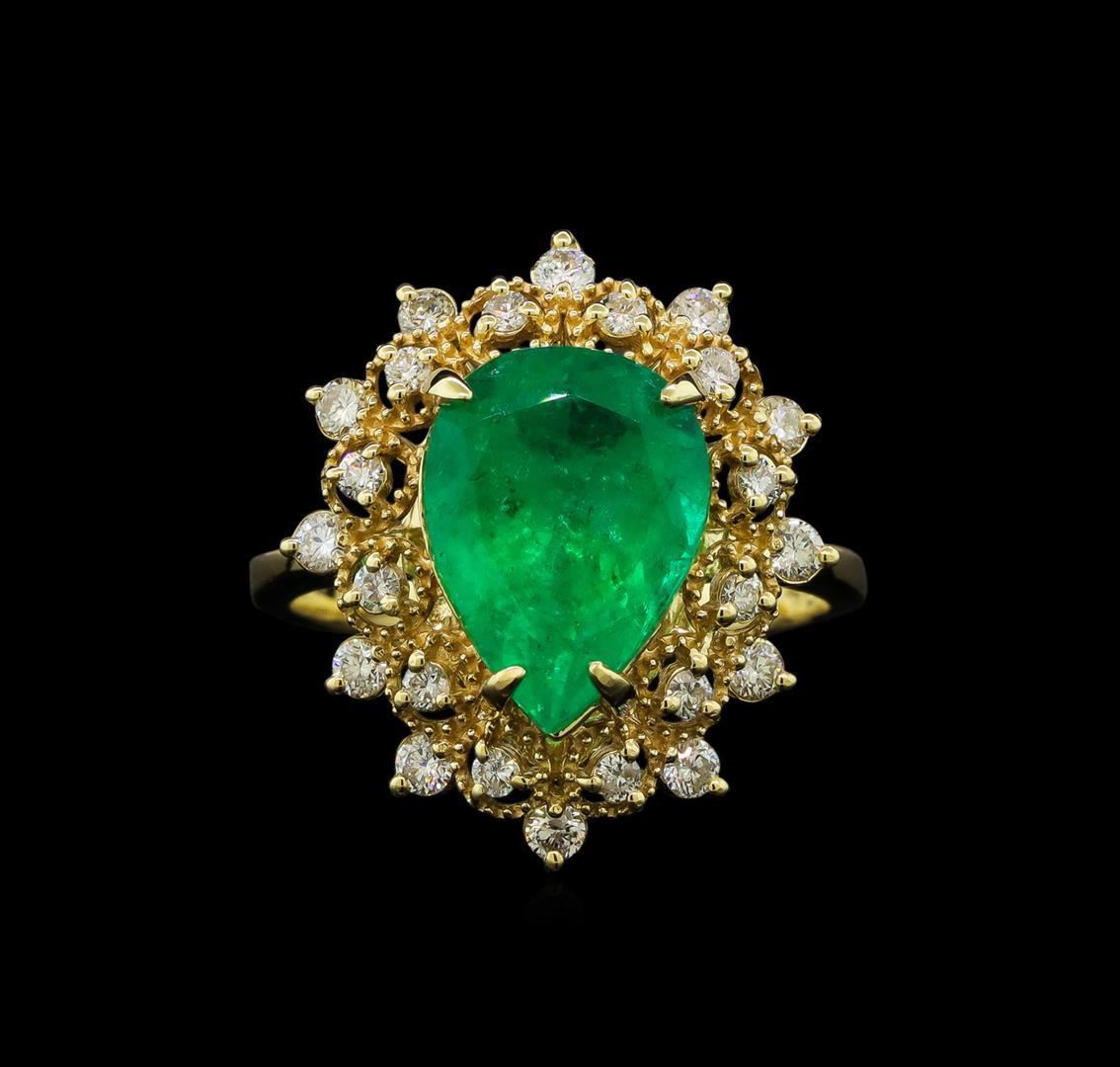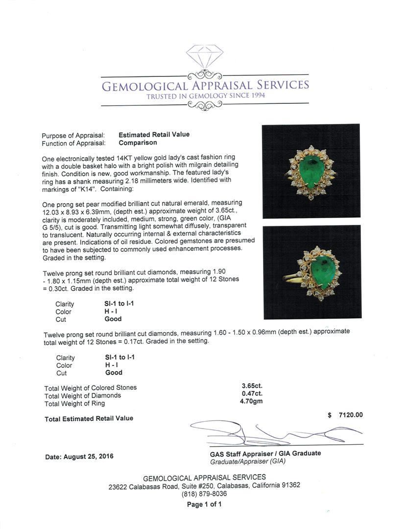 One electronically tested 14KT yellow gold lady's cast fashion ring with a double basket halo with a bright polish with milgrain detailing finish. The featured lady's ring has a shank measuring 2.18 millimeters wide. Identified with markings of 'K14'. Condition is new, good workmanship. Containing: One prong set pear modified brilliant cut natural emerald, measuring 12.03 x 8.93 x 6.39mm, (depth est.) approximate weight of 3.65ct., clarity is moderately included, medium, strong, green color, (GIA G 5/5), cut is good. Transmitting light somewhat diffusely, transparent to translucent. Naturally occurring internal & external characteristics are present. Indications of oil residue. Colored gemstones are presumed to have been subjected to commonly used enhancement processes. Graded in the setting. Twelve prong set round brilliant cut diamonds, measuring 1.90 - 1.80 x 1.15mm (depth est.) approximate total weight of 12 Stones = 0.30ct. Graded in the setting. Clarity SI-1 to I-1. Color: H - I Cut Good Twelve prong set round brilliant cut diamonds, measuring 1.60 - 1.50 x 0.96mm (depth est.) approximate total weight of 12 Stones = 0.17ct. Graded in the setting. Clarity SI-1 to I-1. Color: H - I Cut Good. Total Weight of Colored Stones 3.65ct.. Total Weight of Diamonds 0.47ct.. Total Weight of Ring 4.70gm. GAS Appraised.
