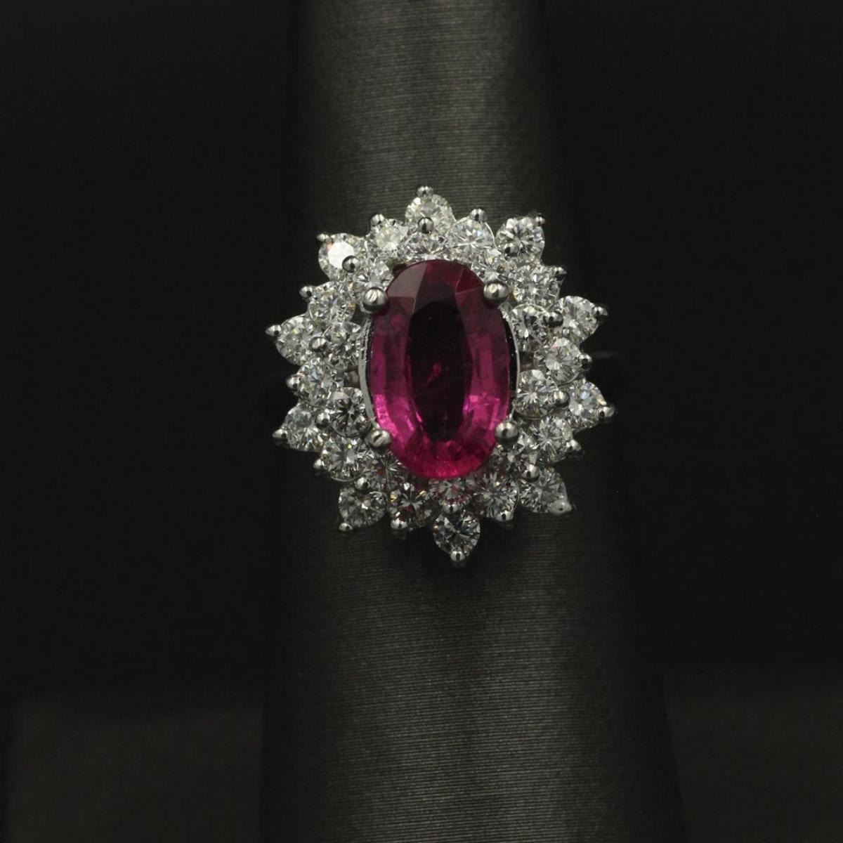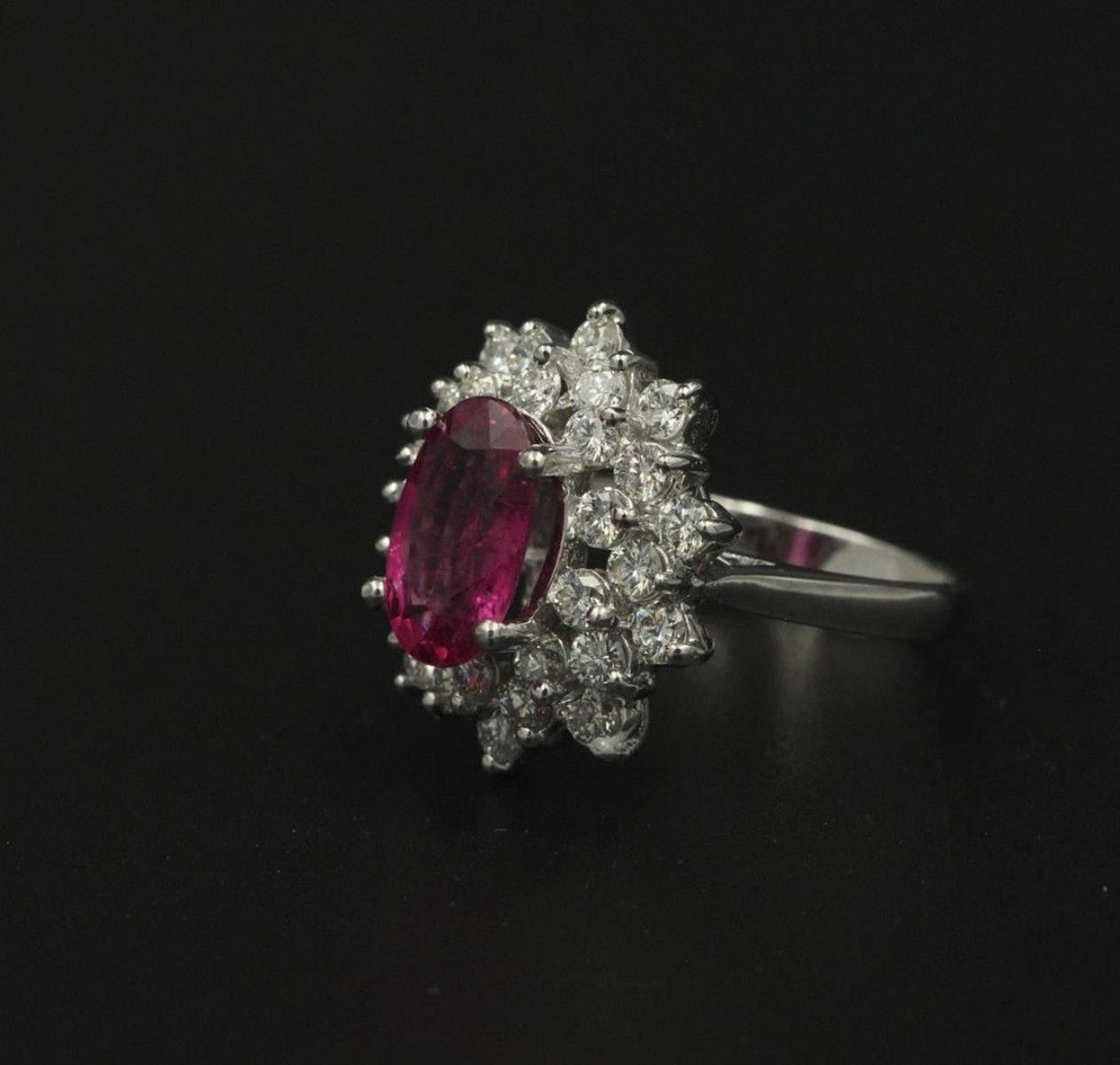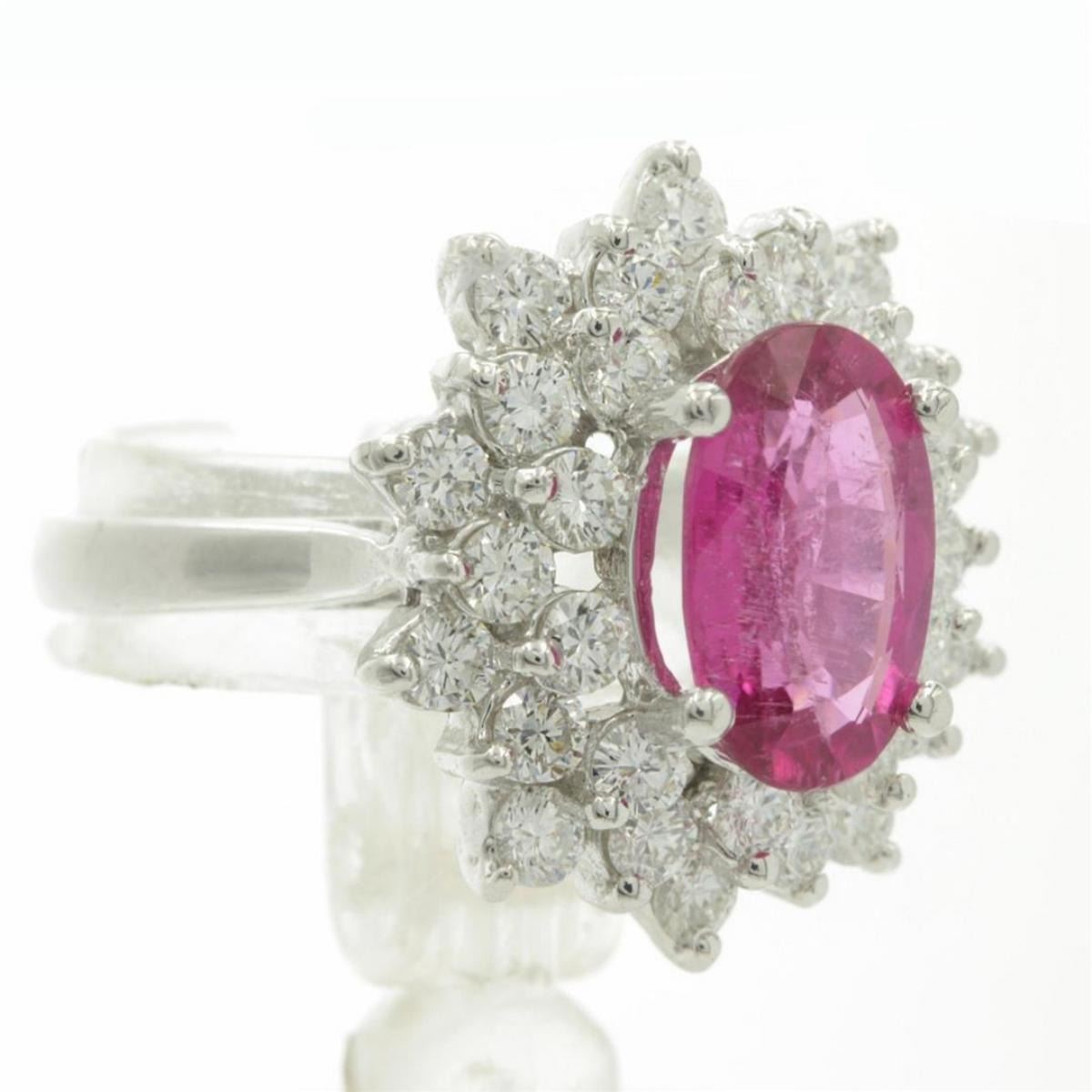 One Round Cut Rubellite Diamonds Oval Cut Flower Ring in 14K White Gold. Total stone weight is 2.15 carats. Size 6.75 can be resized. Setting style is engagement with accent. Gross weight totals 6.15 grams with a total of 31 stones. Condition is brand new. Main stone is non enhanced / natural straight from mother earth. Main stone weight is 2.15 carats with oval shape, fine deep color, and excellent cut. Side stones are natural and non-enhanced with a total stone weight of 1.51 carats. Side diamond shape is brilliant round cut with VS 1 clarity, G-H color, fine cut, with a total of 30 diamonds. Included with independent certification with a retail value of $9,900.