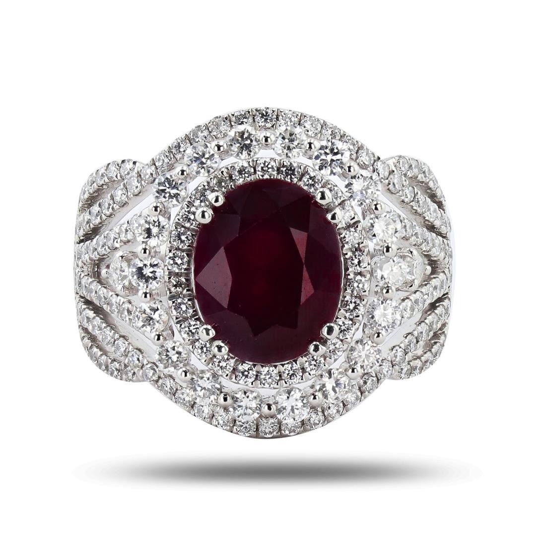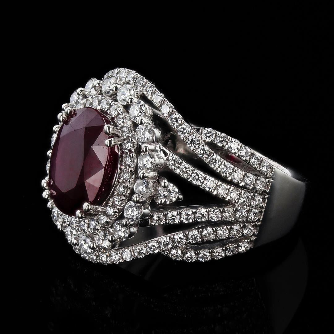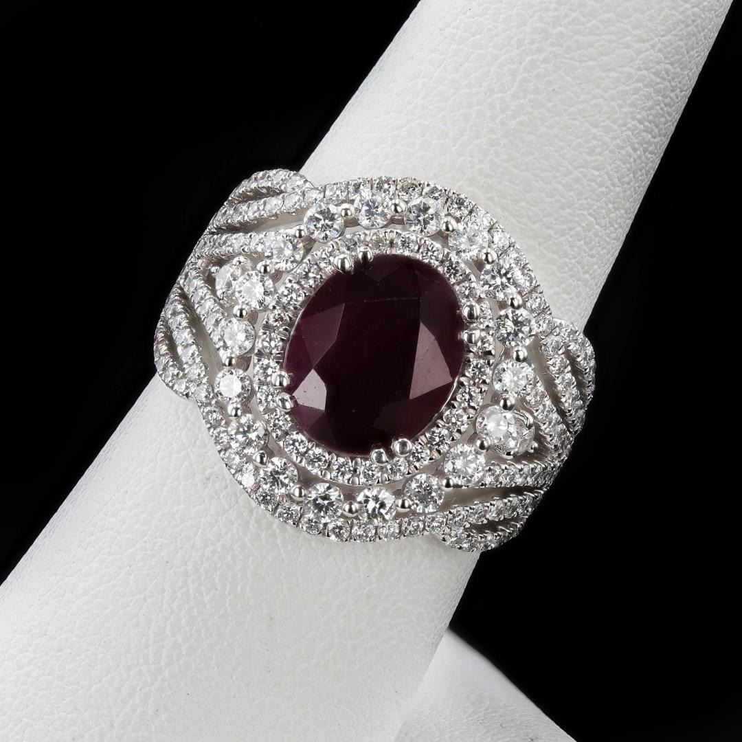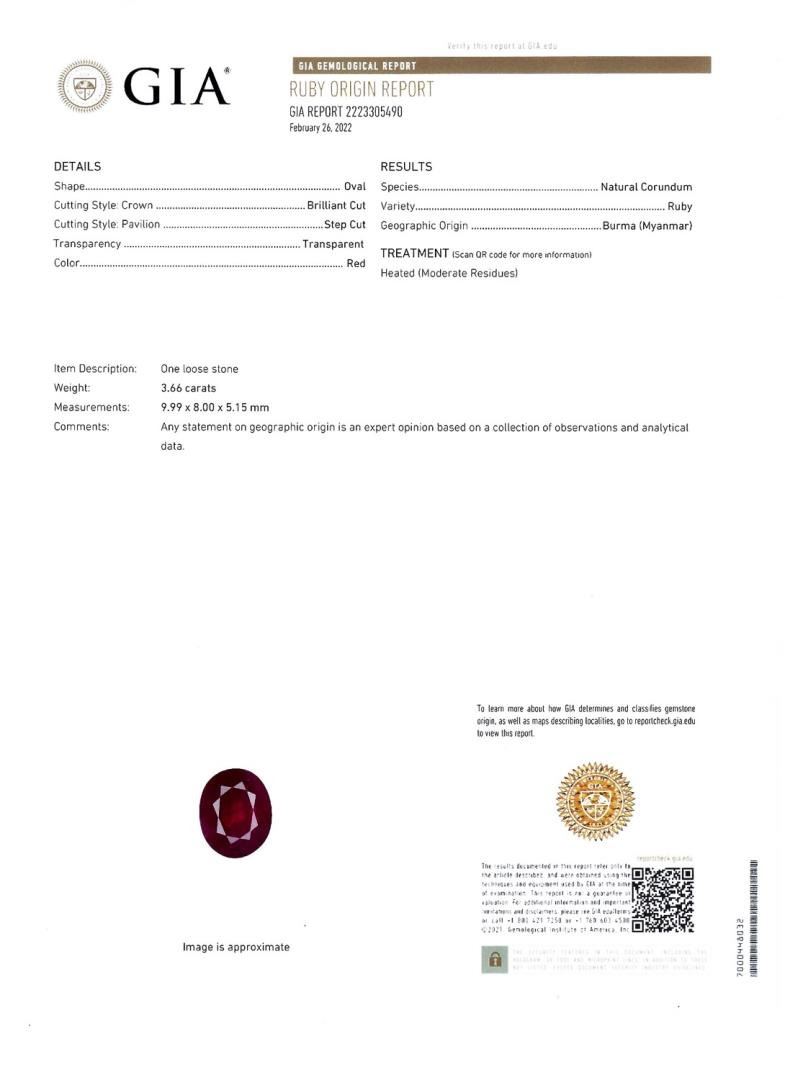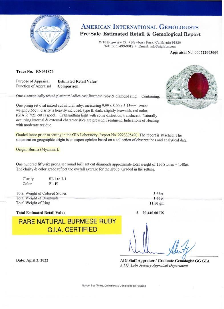 One electronically tested platinum ladies cast Burmese ruby & diamond ring.; One prong set oval mixed cut natural ruby, measuring 9.99 x 8.00 x 5.15mm, exact weight 3.66ct., clarity is heavily included, type II, dark, slightly brownish, red color, (GIA R 7/2), cut is good. Transmitting light with some distortion, translucent. Naturally occurring internal & external characteristics are present. Treatment: Indications of Heating with moderate residue.; Graded loose prior to setting in the GIA Laboratory, Report No. 2223305490. The report is attached. The statement on geographic origin is an expert opinion based on a collection of observations and analytical data. Origin: Burma (Myanmar).; One hundred fifty-six prong set round brilliant cut diamonds approximate total weight of 156 Stones = 1.40ct. The clarity & color grade reflect the overall average for the group. Graded in the setting.; Clarity: SI-1 to I-1; Color: F-H; Total Weight of Colored Stones: 3.66ct.; Total Weight of Diamonds: 1.40ct.; Total Weight of Ring: 11.50 gm #Size: 7 1/4