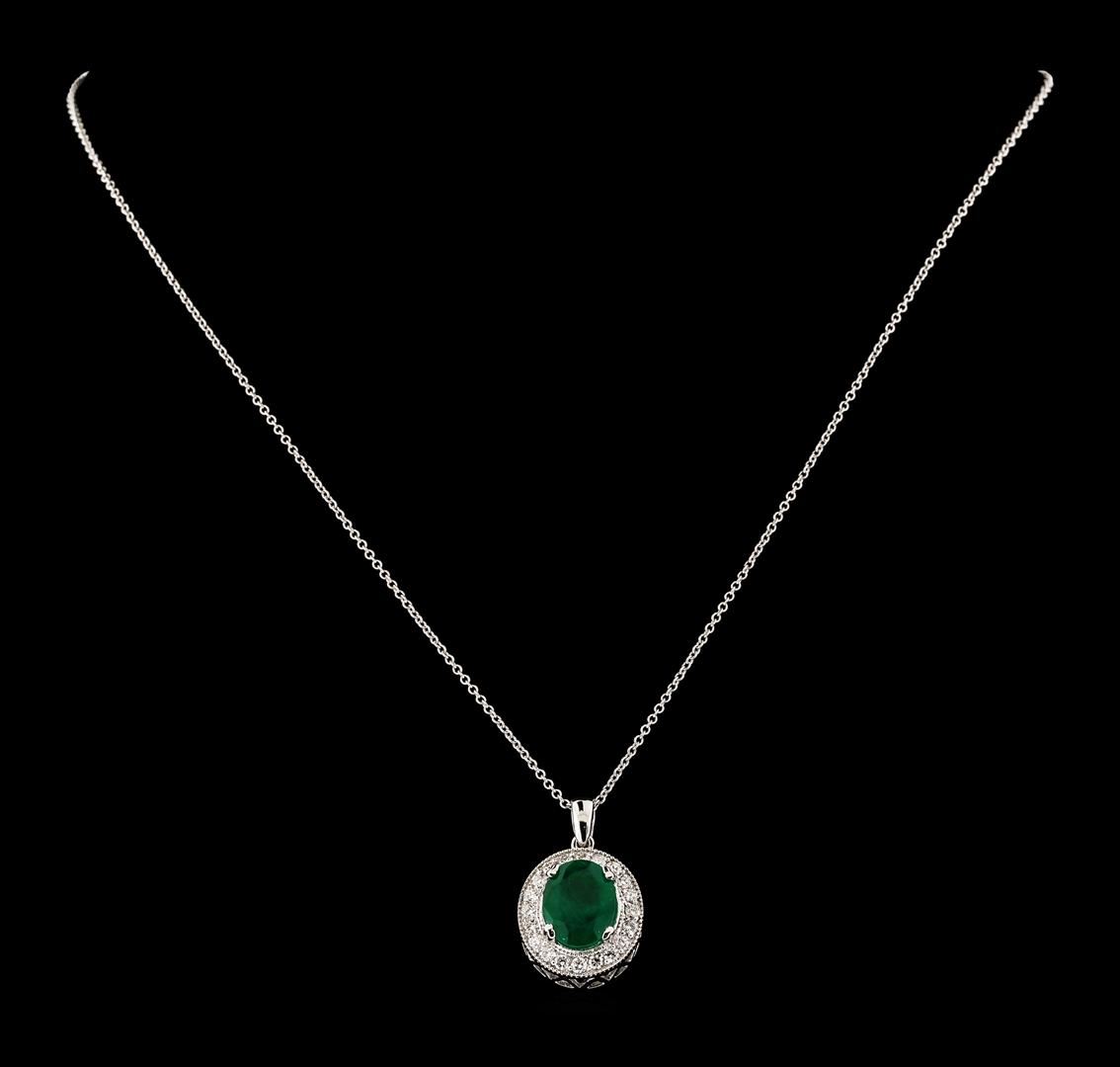 One electronically tested 14KT white gold lady's combination cast & assembled fashion pendant & chain 18.0' long, 1.2mm oval cable link with a lobster claw clasp with a halo with a bright polish finish. Identified with markings of '14K'. Condition is new, good workmanship. Containing: One prong set oval modified mixed cut natural emerald, measuring 10.70 x 8.90 x 4.91mm, (depth est.) 20%. bulge factor, approximate weight of 3.66ct., clarity is heavily included, medium dark, moderately strong, green color, (GIA G 6/4), cut is good. Transmitting light somewhat diffusely, semi-transparent to translucent. Naturally occurring internal & external characteristics are present. Indications of oil residue. Colored gemstones are presumed to have been subjected to commonly used enhancement processes. Graded in the setting. Twenty prong set round brilliant cut diamonds, measuring 2.00 - 1.90 x 1.21mm (depth est.) approximate total weight of 20 Stones = 0.57ct. Graded in the setting. Clarity SI-1 to SI-2. Color: G - I Cut Good. Total Weight of Colored Stones 3.66ct.. Total Weight of Diamonds 0.57ct.. Total Weight of Pendant & Chain 5.80gm. GAS Appraised at $4,840.00.