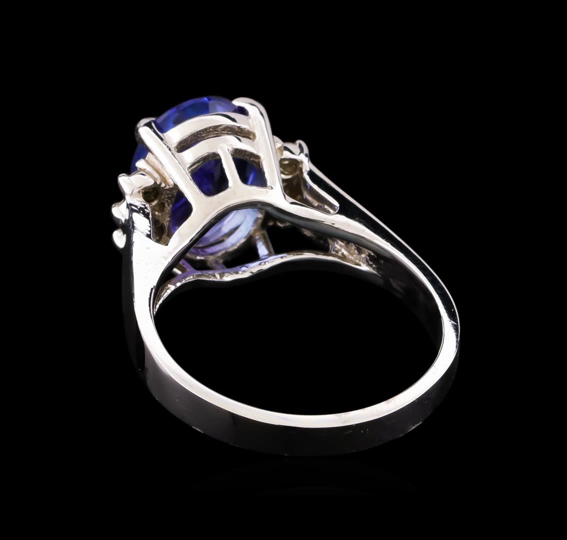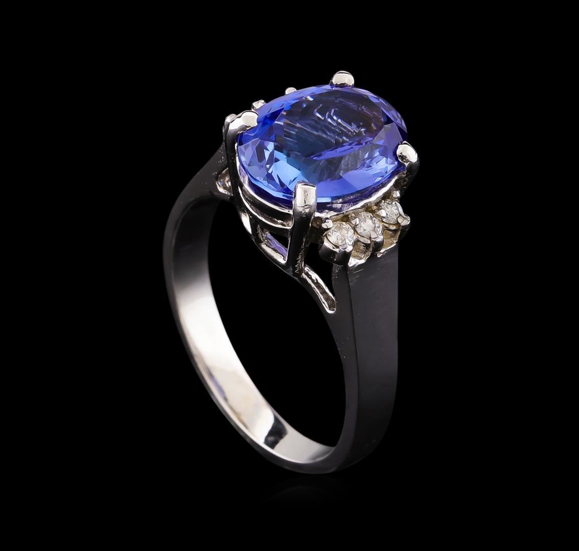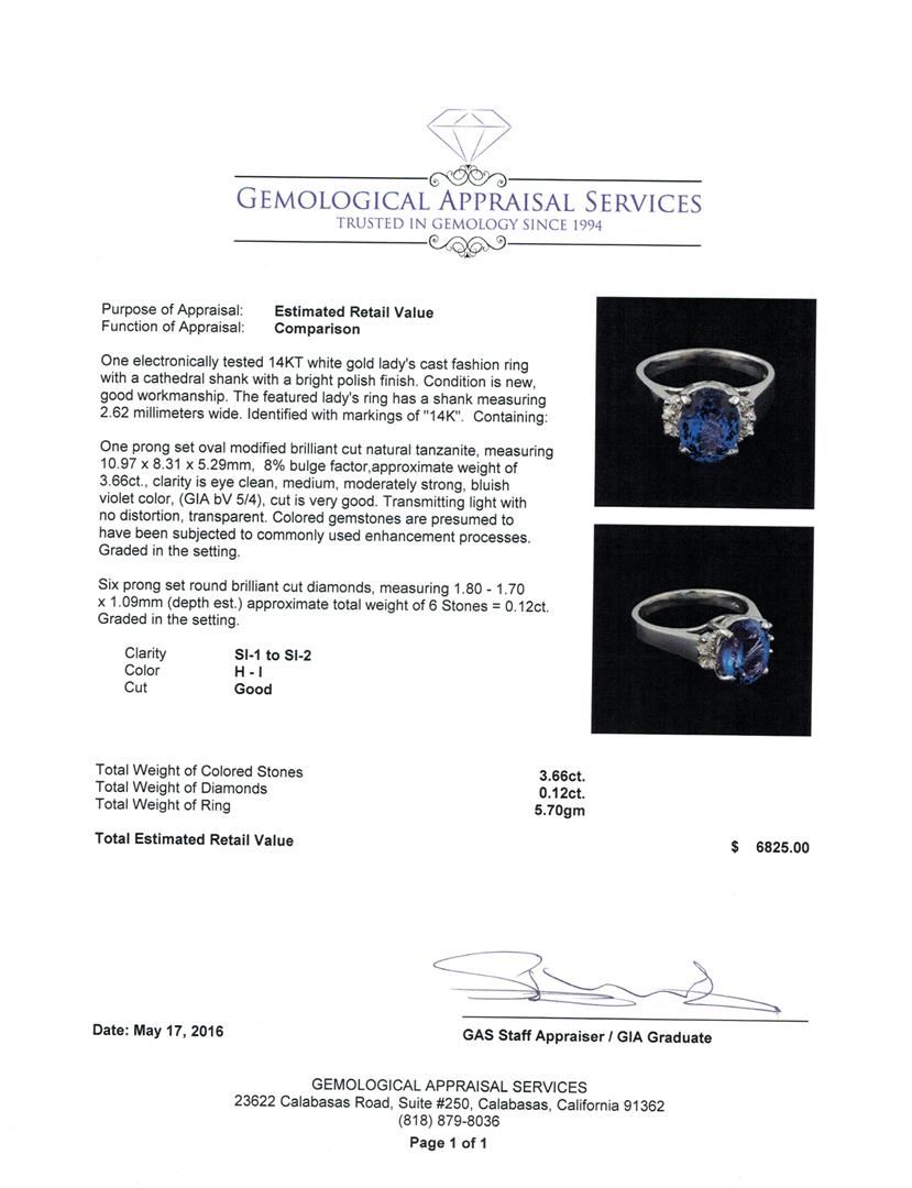 One electronically tested 14KT white gold lady's cast fashion ring with a cathedral shank with a bright polish finish. The featured lady's ring has a shank measuring 2.62 millimeters wide. Identified with markings of "14K". Condition is new, good workmanship. Containing: One prong set oval modified brilliant cut natural tanzanite, measuring 10.97 x 8.31 x 5.29mm, 8%. bulge factor, approximate weight of 3.66ct., clarity is eye clean, medium, moderately strong, bluish violet color, (GIA bV 5/4), cut is very good. Transmitting light with no distortion, transparent. Colored gemstones are presumed to have been subjected to commonly used enhancement processes. Graded in the setting. Six prong set round brilliant cut diamonds, measuring 1.80 - 1.70 x 1.09mm (depth est.) approximate total weight of 6 Stones = 0.12ct. Graded in the setting. Clarity: SI-1 to SI-2. Color: H - I. Cut Good. Total Weight of Colored Stones 3.66ct. Total Weight of Diamonds 0.12ct. Total Weight of Ring 5.70gm.