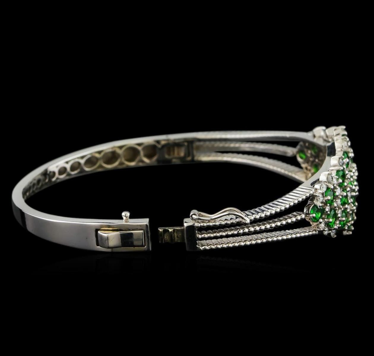 One electronically tested 14KT white gold lady's cast fashion bangle bracelet with a tongue clasp with foldover safety with a bright polish finish. The featured lady's bracelet has a circumference of approximately 7 inches. Identified with markings of "K14". Condition is new, good workmanship. Containing: Twenty-five prong set round modified brilliant cut natural tsavorite garnets, measuring 3.20 - 3.10 x 2.05 mm, approximate total weight of 3.68ct., clarity is eye clean, type II, medium, moderately strong, green color, (GIA G 5/4), cut is very good. Transmitting light with no distortion, transparent. Colored gemstones are presumed to have been subjected to commonly used enhancement processes. Graded in the setting. Eight prong set round brilliant cut diamonds, measuring 2.50 - 2.40 x 1.47mm (depth est.) approximate total weight of 8 Stones = 0.42ct. Graded in the setting. Clarity: SI-1 to SI-2. Color: H - I. Cut Very Good Forty-Six prong set round brilliant cut diamonds, measuring 1.90 - 1.70 x 1.08mm (depth est.) approximate total weight of 46 Stones = 0.98ct. Graded in the setting. Clarity: SI-1 to I-1. Color: G - I. Cut Good Four prong set round brilliant cut diamonds, measuring 1.60 - 1.50 x 0.96mm (depth est.) approximate total weight of 4 Stones = 0.06ct. Graded in the setting. Clarity: SI-2 to I-1. Color: H - I. Cut Good. Total Weight of Colored Stones 3.68ct. Total Weight of Diamonds 1.46ct. Total Weight of Bangle Bracelet 24.40gm. GAS Appraised.