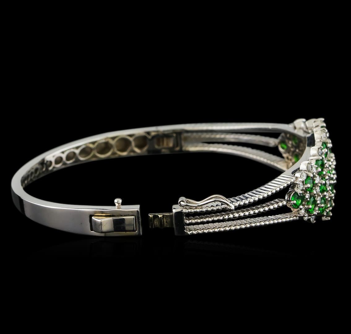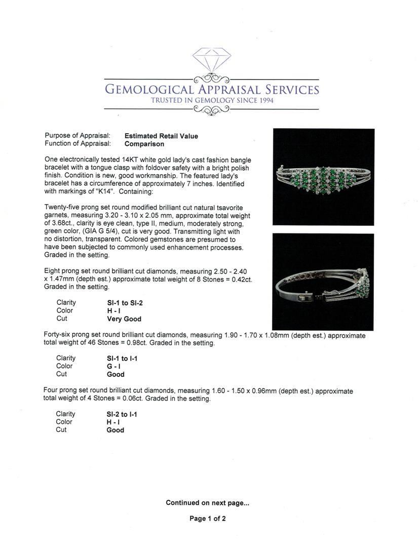 One electronically tested 14KT white gold lady's cast fashion bangle bracelet with a tongue clasp with foldover safety with a bright polish finish. The featured lady's bracelet has a circumference of approximately 7 inches. Identified with markings of "K14". Condition is new, good workmanship. Containing: Twenty-five prong set round modified brilliant cut natural tsavorite garnets, measuring 3.20 - 3.10 x 2.05 mm, approximate total weight of 3.68ct., clarity is eye clean, type II, medium, moderately strong, green color, (GIA G 5/4), cut is very good. Transmitting light with no distortion, transparent. Colored gemstones are presumed to have been subjected to commonly used enhancement processes. Graded in the setting. Eight prong set round brilliant cut diamonds, measuring 2.50 - 2.40 x 1.47mm (depth est.) approximate total weight of 8 Stones = 0.42ct. Graded in the setting. Clarity: SI-1 to SI-2. Color: H - I. Cut Very Good Forty-Six prong set round brilliant cut diamonds, measuring 1.90 - 1.70 x 1.08mm (depth est.) approximate total weight of 46 Stones = 0.98ct. Graded in the setting. Clarity: SI-1 to I-1. Color: G - I. Cut Good Four prong set round brilliant cut diamonds, measuring 1.60 - 1.50 x 0.96mm (depth est.) approximate total weight of 4 Stones = 0.06ct. Graded in the setting. Clarity: SI-2 to I-1. Color: H - I. Cut Good. Total Weight of Colored Stones 3.68ct. Total Weight of Diamonds 1.46ct. Total Weight of Bangle Bracelet 24.40gm. GAS Appraised.