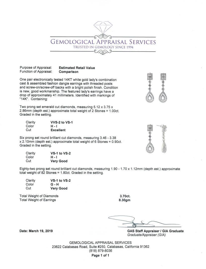 One pair electronically tested 14KT white gold lady's combination cast & assembled fashion dangle earrings with threaded posts and screw-on/screw-off backs with a bright polish finish. The featured lady's earrings have a drop of approximately 41 millimeters. Identified with markings of '14K'. Condition is new, good workmanship. Containing: Two prong set emerald cut diamonds, measuring 5.12 x 3.75 x 2.86mm (depth est.) approximate total weight of 2 Stones = 1.00ct. Graded in the setting. Color H - I Clarity VVS-2 to VS-1 Cut Excellent Six prong set round brilliant cut diamonds, measuring 3.46 - 3.38 x 2.10mm (depth est.) approximate total weight of 6 Stones = 0.90ct. Graded in the setting. Color H - I Clarity VS-1 to VS-2 Cut Very Good Eighty-Two prong set round brilliant cut diamonds, measuring 1.90 - 1.70 x 1.12mm (depth est.) approximate total weight of 82 Stones = 1.80ct. Graded in the setting. Color G - H Clarity VS-1 to VS-2 Cut Very Good. Total Weight of Diamonds 3.70ct.. Total Weight of Earrings 8.30gm GAS Appraised at $14090.00. GAS Appraised.