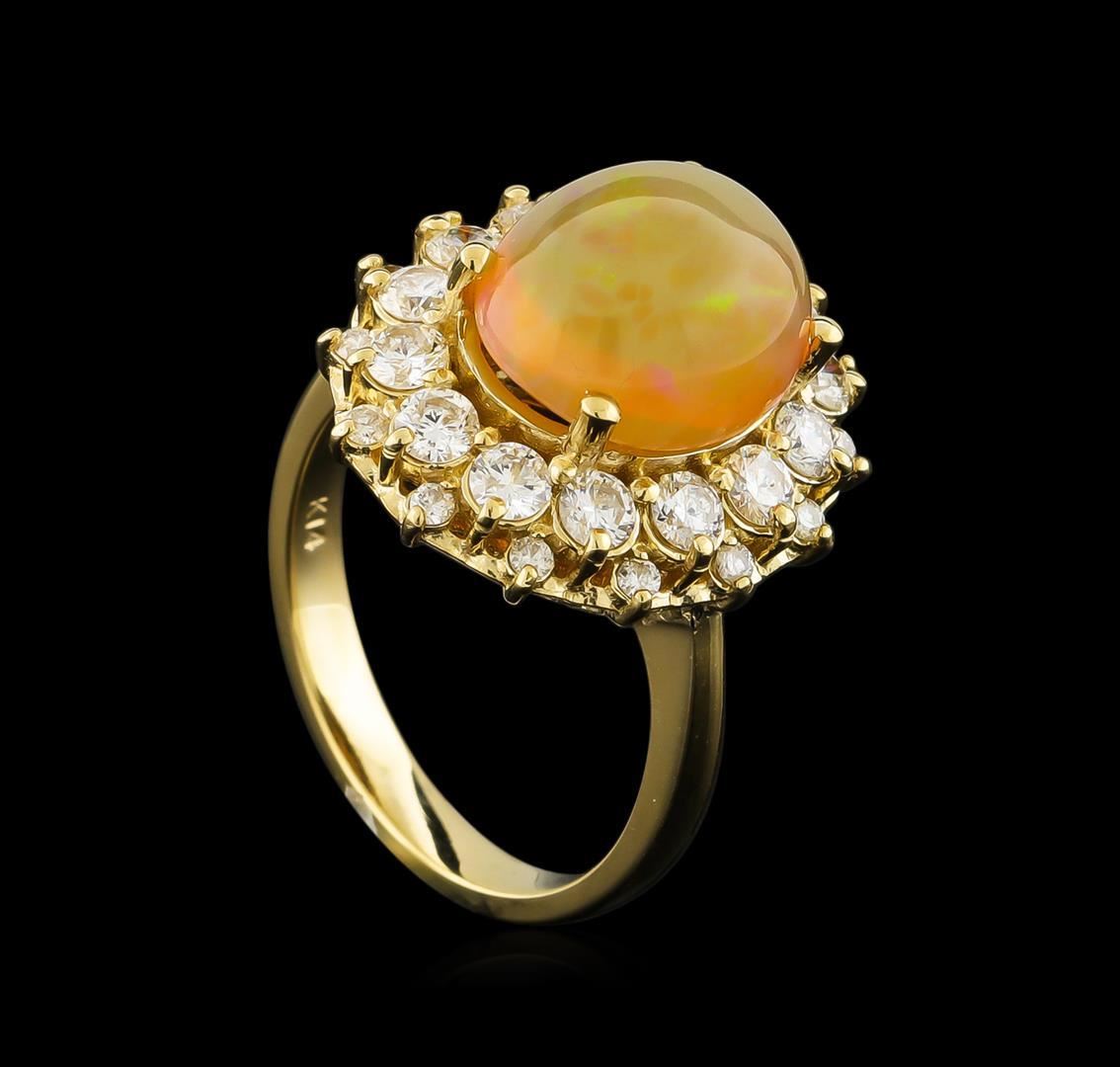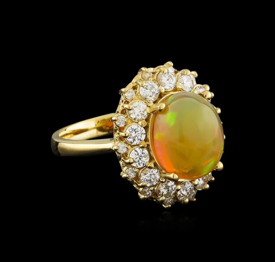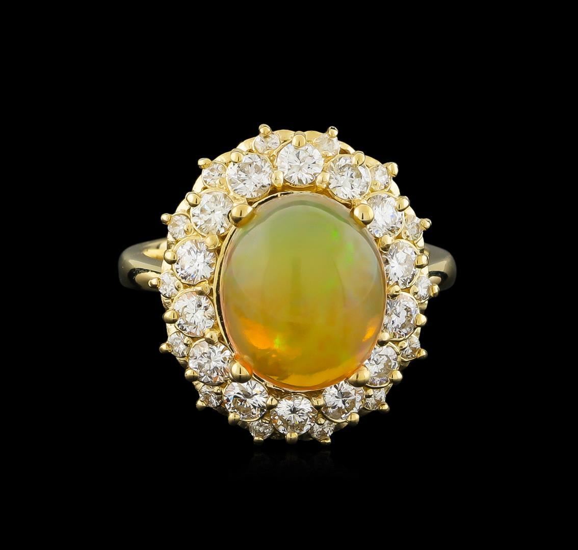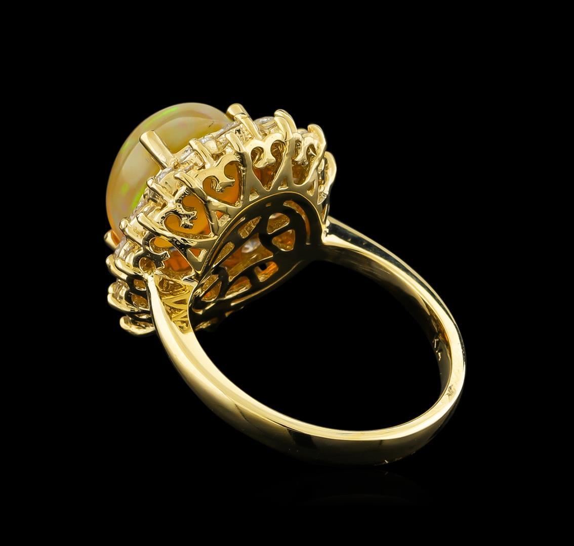 One electronically tested 14KT yellow gold lady's cast fashion ring with a double basket halo with a bright polish finish. The featured lady's ring has a shank measuring 2.91 millimeters wide. Identified with markings of "K14". Condition is new, good workmanship. Containing: One semi crystal opal that is cut in a oval shaped cabochon and is prong set, measuring 12.08 mm long x 10.15 mm wide, and 6.45 mm thick and the approximate weight is 3.70 carats. The opal has a somewhat bright, orange-green play of color (fire) in a rolling flashfire pattern; a high dome; a good cut; slightly included; consistent in its brightness and pattern; and is not directional. Graded in the setting. Fourteen prong set round brilliant cut diamonds, measuring 2.80 - 2.70 x 1.71mm (depth est.) approximate total weight of 14 Stones = 1.10ct. Graded in the setting. Clarity: SI-1 to SI-2. Color: H - I. Cut Very Good Fourteen prong set round brilliant cut diamonds, measuring 1.60 - 1.50 x 0.93mm (depth est.) approximate total weight of 14 Stones = 0.19ct. Graded in the setting. Clarity: SI-1 to I-1. Color: H - I. Cut Good. Total Weight of Diamonds 1.29ct. Total Weight of Opals 3.70ct. Total Weight of Ring 7.60gm. GAS Appraised.