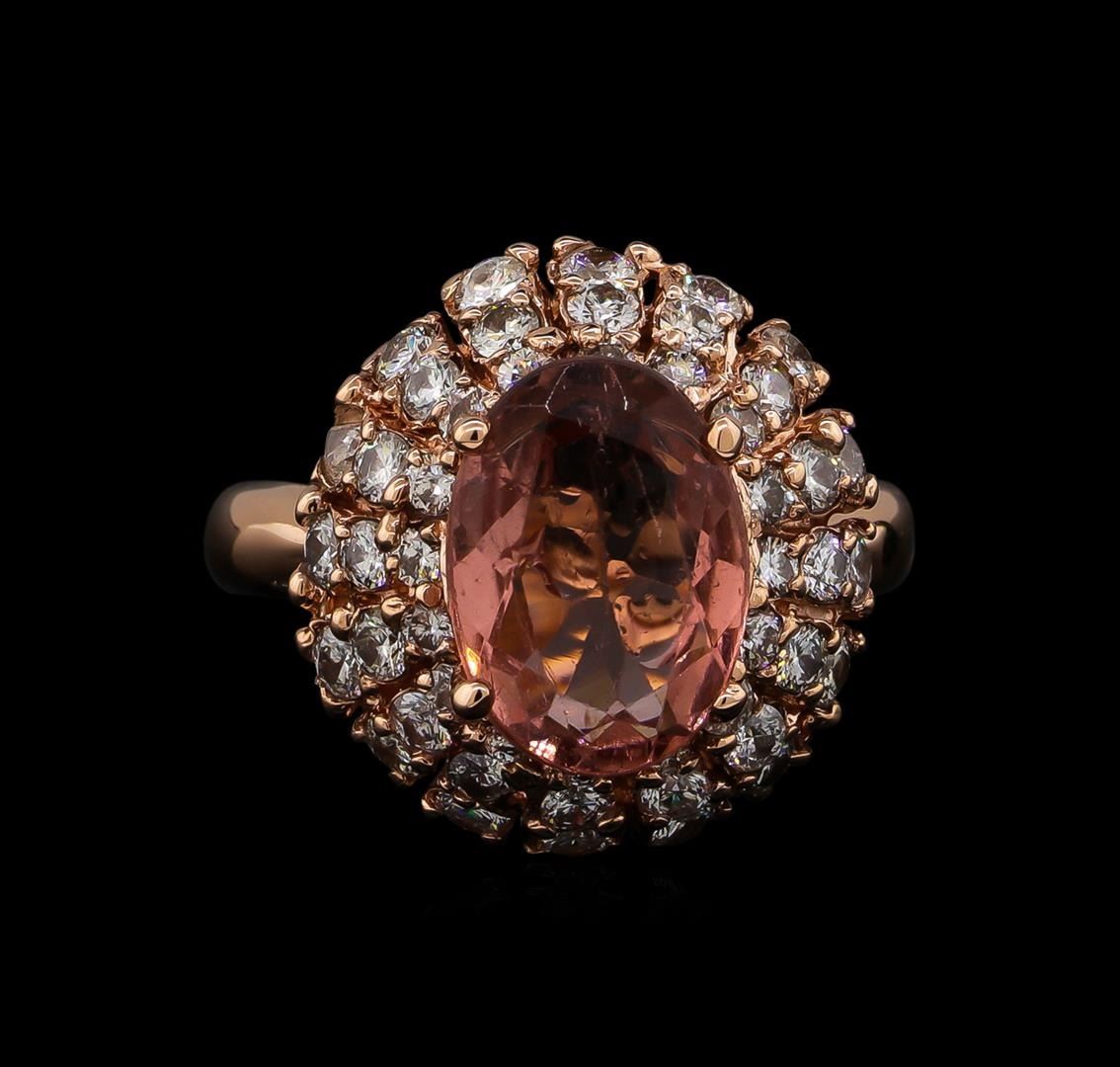 One electronically tested 14KT rose gold lady's cast dome style ring with a triple basket halo with a bright polish finish. The featured lady's ring has a shank measuring 2.20 millimeters wide. Identified with markings of "14K". Condition is like new, good workmanship. Containing: One prong set oval modified brilliant cut natural tourmaline, measuring 12.19 x 8.82 x 4.59mm, 15%. bulge factor, approximate weight of 3.70 ct., clarity is slightly included, medium, very slightly brownish, orangy red color, (GIA oR 5/3), cut is good. Transmitting light with a minimum of distortion, transparent. Colored gemstones are presumed to have been subjected to commonly used enhancement processes. Graded in the setting. Sixteen prong set round brilliant cut diamonds, measuring 2.30 - 2.20 x 1.40mm (depth est.) approximate total weight of 16 Stones = 0.70 ct. Graded in the setting. Clarity: SI-1 to SI-2. Color: H - I. Cut Good Sixteen prong set round brilliant cut diamonds, measuring 2.10 - 2.05 x 1.29mm (depth est.) approximate total weight of 16 Stones = 0.56ct. Graded in the setting. Clarity: SI-1 to SI-2. Color: H - I. Cut Good Sixteen prong set round brilliant cut diamonds, measuring 1.90 - 1.80 x 1.15mm (depth est.) approximate total weight of 16 Stones = 0.39ct. Graded in the setting. Clarity: VS-2 to SI-1. Color: H - I. Cut Good. Total Weight of Colored Stones 3.70 ct. Total Weight of Diamonds 1.65ct. Total Weight of Ring 7.90gm GAS Appraised.