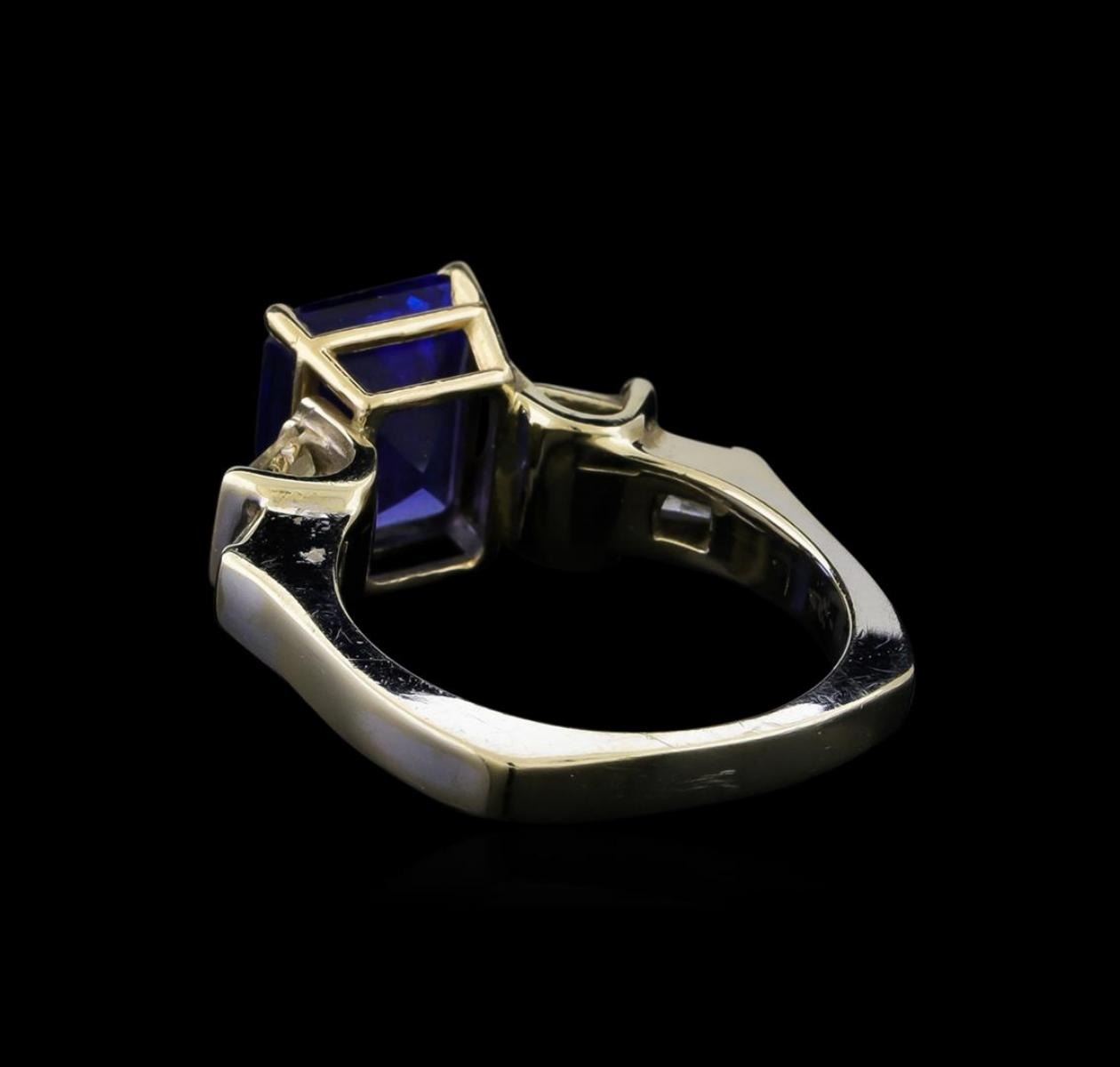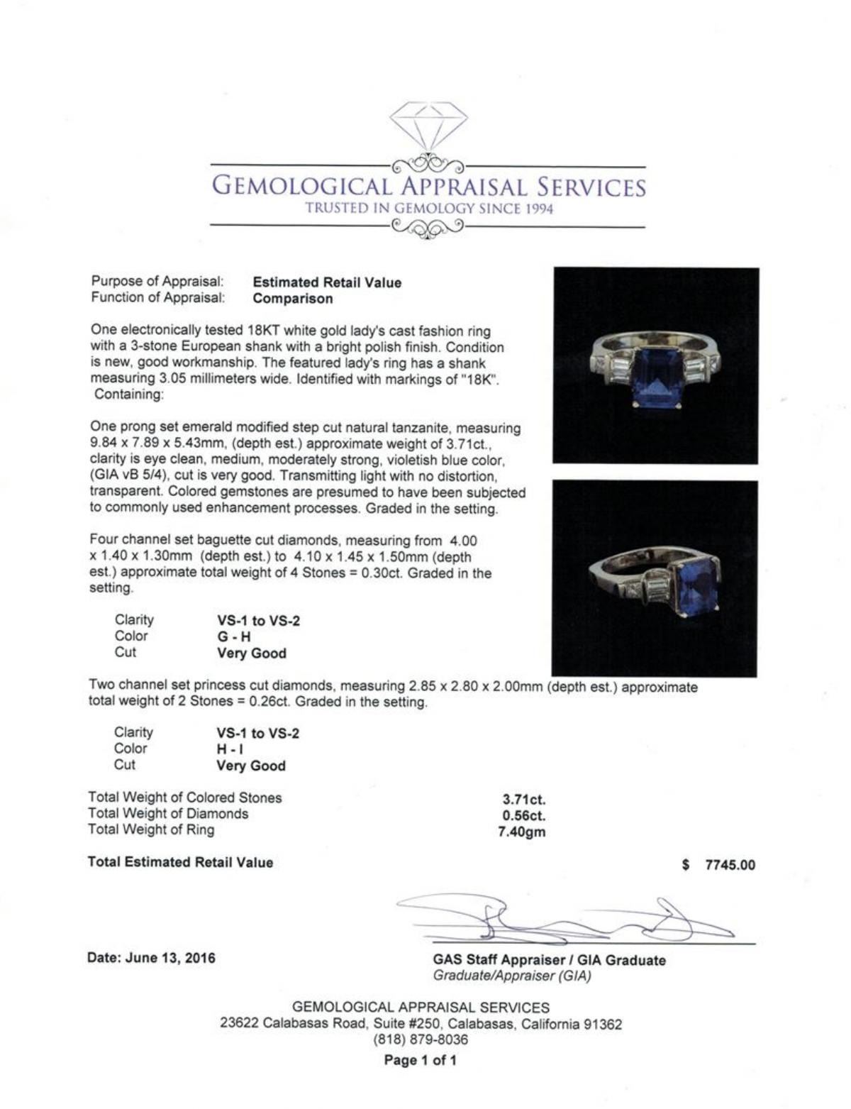 One electronically tested 18KT white gold lady's cast fashion ring with a 3-stone European shank with a bright polish finish. The featured lady's ring has a shank measuring 3.05 millimeters wide. Identified with markings of "18K". Condition is new, good workmanship. Containing: One prong set emerald modified step cut natural tanzanite, measuring 9.84 x 7.89 x 5.43mm, (depth est.) approximate weight of 3.71ct., clarity is eye clean, medium, moderately strong, violetish blue color, (GIA vB 5/4), cut is very good. Transmitting light with no distortion, transparent. Colored gemstones are presumed to have been subjected to commonly used enhancement processes. Graded in the setting. Four channel set baguette cut diamonds, measuring from 4.00 x 1.40 x 1.30mm (depth est.) to 4.10 x 1.45 x 1.50mm (depth est.) approximate total weight of 4 Stones = 0.30ct. Graded in the setting. Clarity: VS-1 to VS-2. Color: G - Very Good Two channel set princess cut diamonds, measuring 2.85 x 2.80 x 2.00mm (depth est.) approximate total weight of 2 Stones = 0.26ct. Graded in the setting. Clarity: VS-1 to VS-2. Color: H - I. Cut Very Good. Total Weight of Colored Stones 3.71ct. Total Weight of Diamonds 0.56ct. Total Weight of Ring 7.40gm. GAS Appraised.