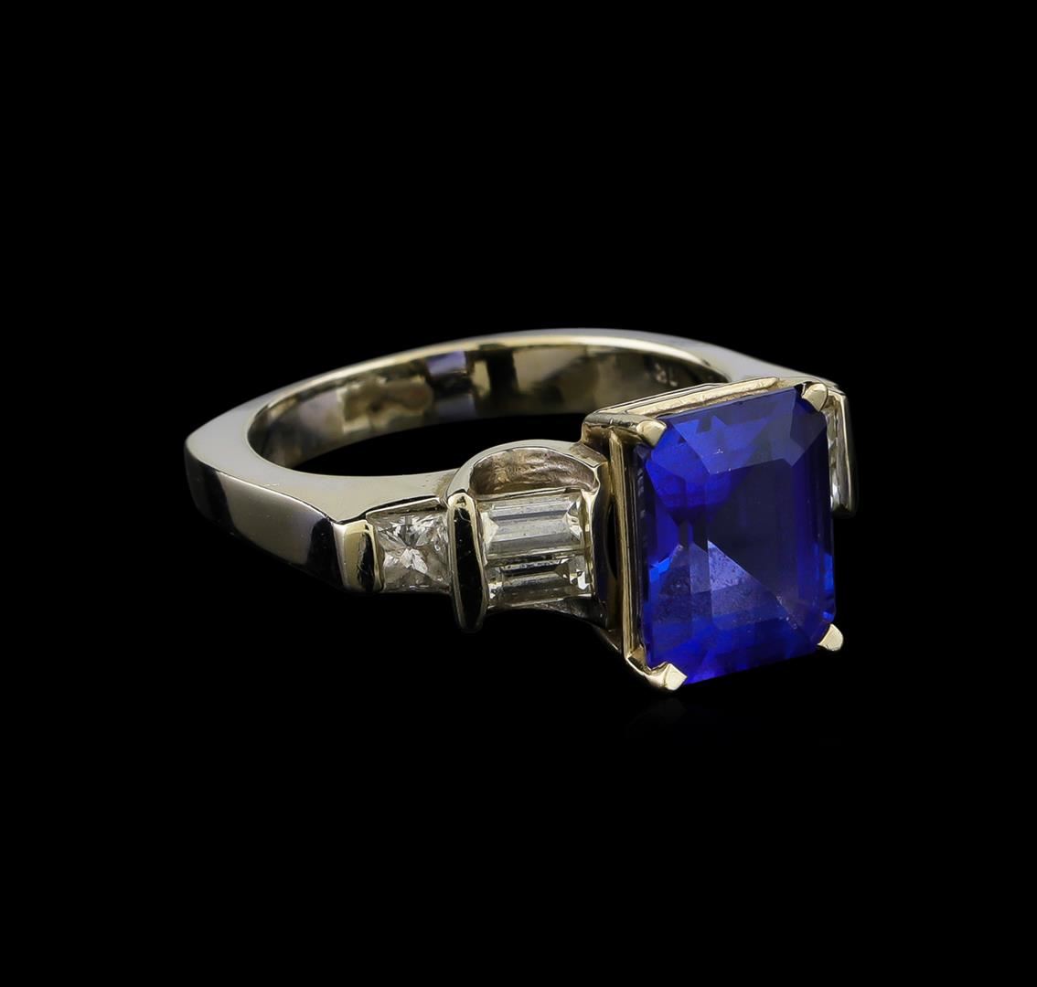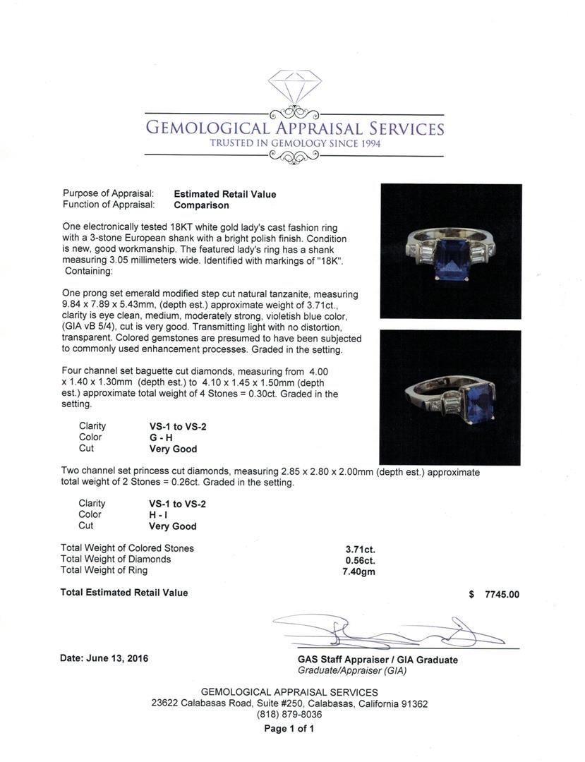 One electronically tested 18KT white gold lady's cast fashion ring with a 3-stone European shank with a bright polish finish. The featured lady's ring has a shank measuring 3.05 millimeters wide. Identified with markings of "18K". Condition is new, good workmanship. Containing: One prong set emerald modified step cut natural tanzanite, measuring 9.84 x 7.89 x 5.43mm, (depth est.) approximate weight of 3.71ct., clarity is eye clean, medium, moderately strong, violetish blue color, (GIA vB 5/4), cut is very good. Transmitting light with no distortion, transparent. Colored gemstones are presumed to have been subjected to commonly used enhancement processes. Graded in the setting. Four channel set baguette cut diamonds, measuring from 4.00 x 1.40 x 1.30mm (depth est.) to 4.10 x 1.45 x 1.50mm (depth est.) approximate total weight of 4 Stones = 0.30ct. Graded in the setting. Clarity: VS-1 to VS-2. Color: G - Very Good Two channel set princess cut diamonds, measuring 2.85 x 2.80 x 2.00mm (depth est.) approximate total weight of 2 Stones = 0.26ct. Graded in the setting. Clarity: VS-1 to VS-2. Color: H - I. Cut Very Good. Total Weight of Colored Stones 3.71ct. Total Weight of Diamonds 0.56ct. Total Weight of Ring 7.40gm. GAS Appraised.