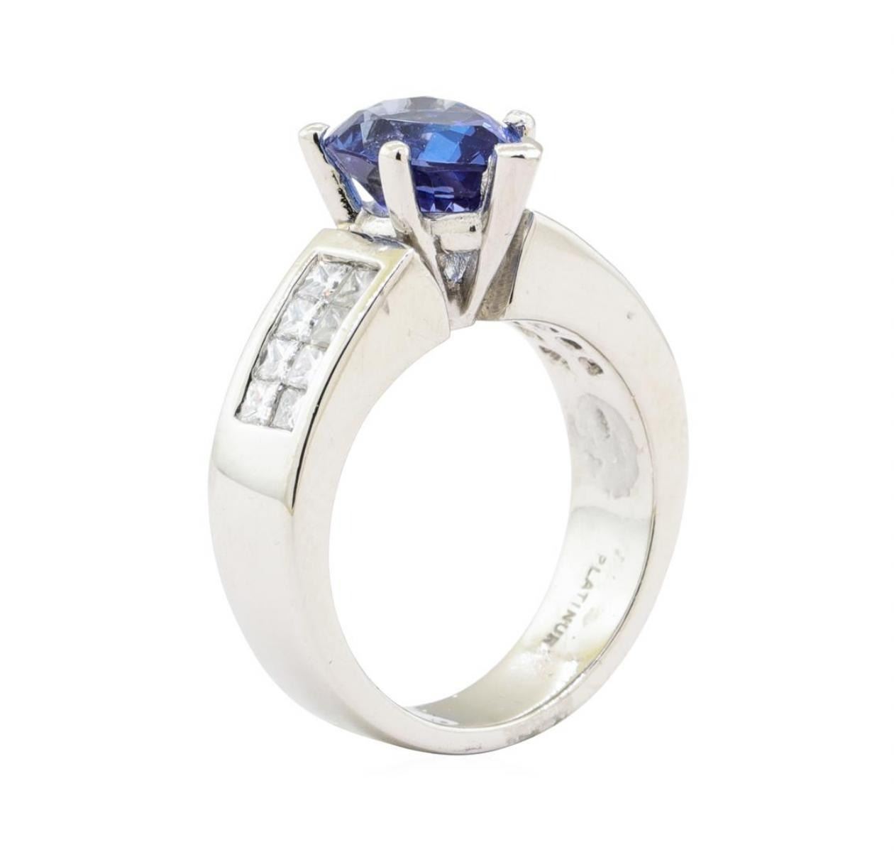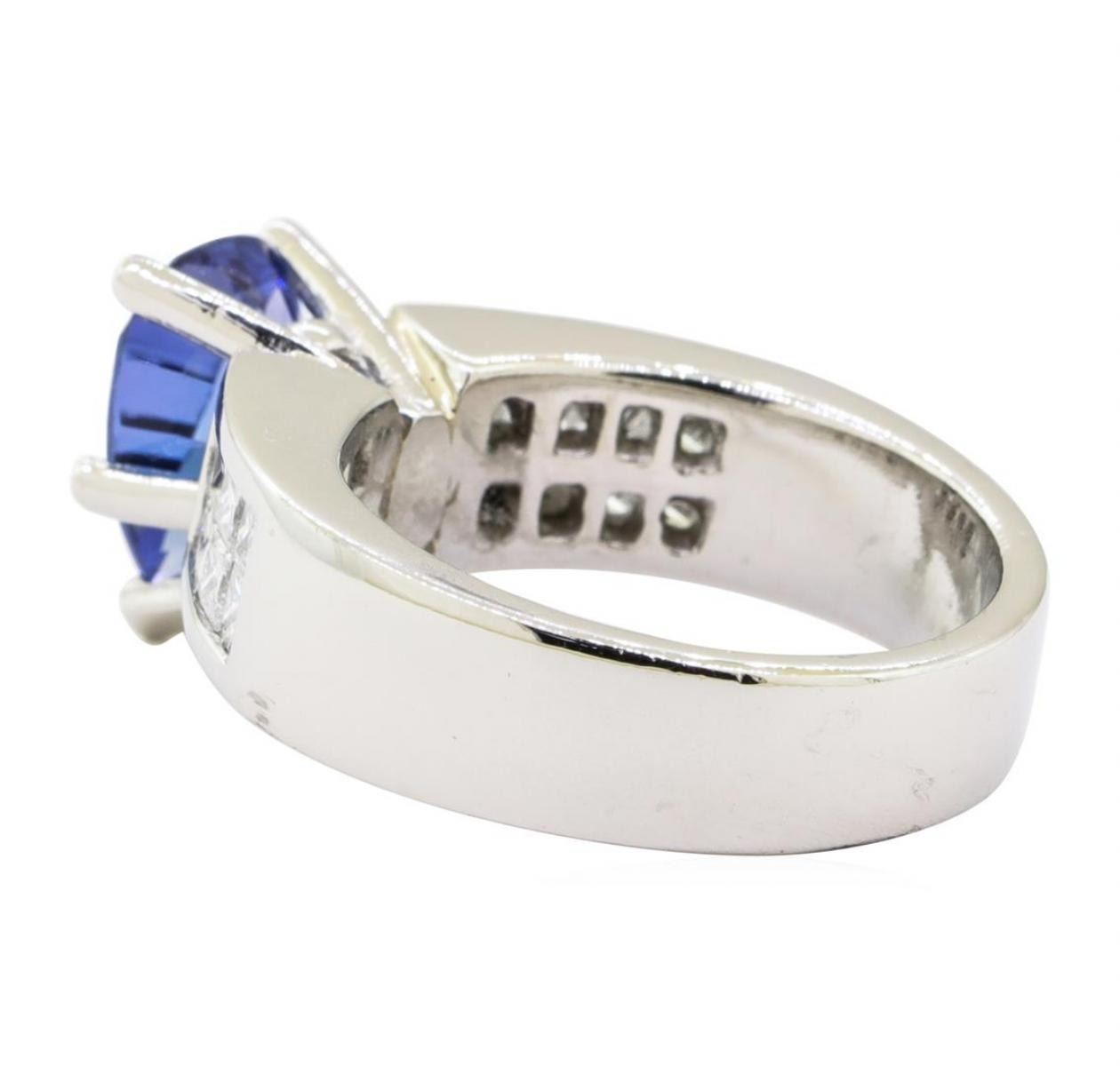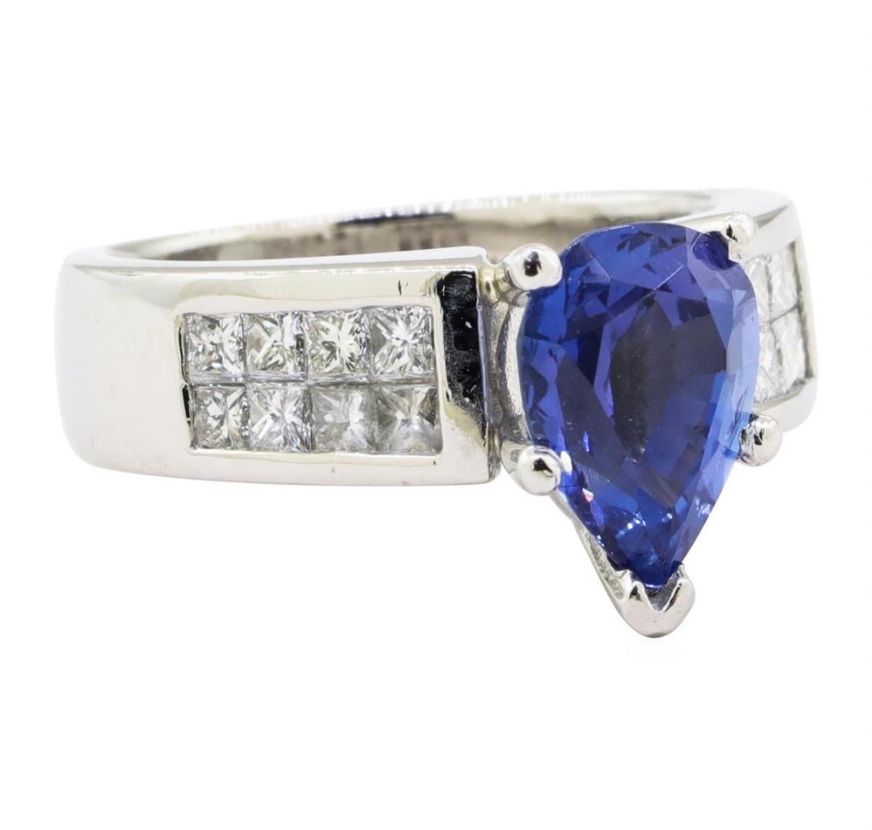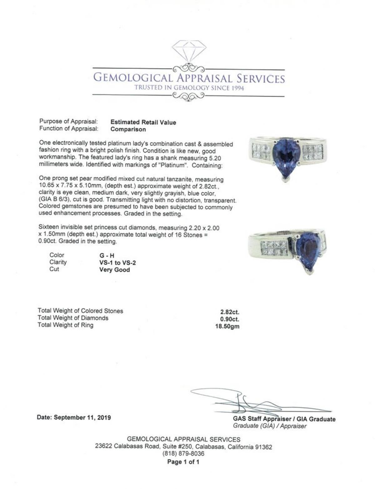 One electronically tested platinum lady's combination cast & assembled fashion ring with a bright polish finish. The featured lady's ring has a shank measuring 5.20 millimeters wide. Identified with markings of 'Platinum'. Condition is Good. Containing: One prong set pear modified mixed cut natural tanzanite, measuring 10.65 x 7.75 x 5.10mm, (depth est.) approximate weight of 2.82ct., clarity is eye clean, medium dark, very slightly grayish, blue color, (GIA B 6/3), cut is good. Transmitting light with no distortion, transparent. Colored gemstones are presumed to have been subjected to commonly used enhancement processes. Graded in the setting. Sixteen invisible set princess cut diamonds, measuring 2.20 x 2.00 x 1.50mm (depth est.) approximate total weight of 16 Stones = 0.90 ct. Graded in the setting. Color G - H Clarity VS-1 to VS-2 Cut Very Good. Total Weight of Colored Stones 2.82ct.. Total Weight of Diamonds 0.90 ct.. Total Weight of Ring 18.50gm GAS Appraised at $8575.00. GAS Appraised.