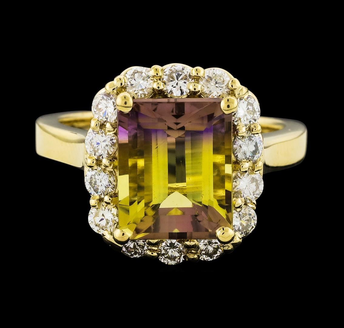 One Ametrine and Diamond Ring featuring: 14KT Yellow Gold with a total weight of 5.86 grams, One Ametrine stone with a total weight of 3.73ct, and 14 Diamonds with a total weight of 0.78ctw.