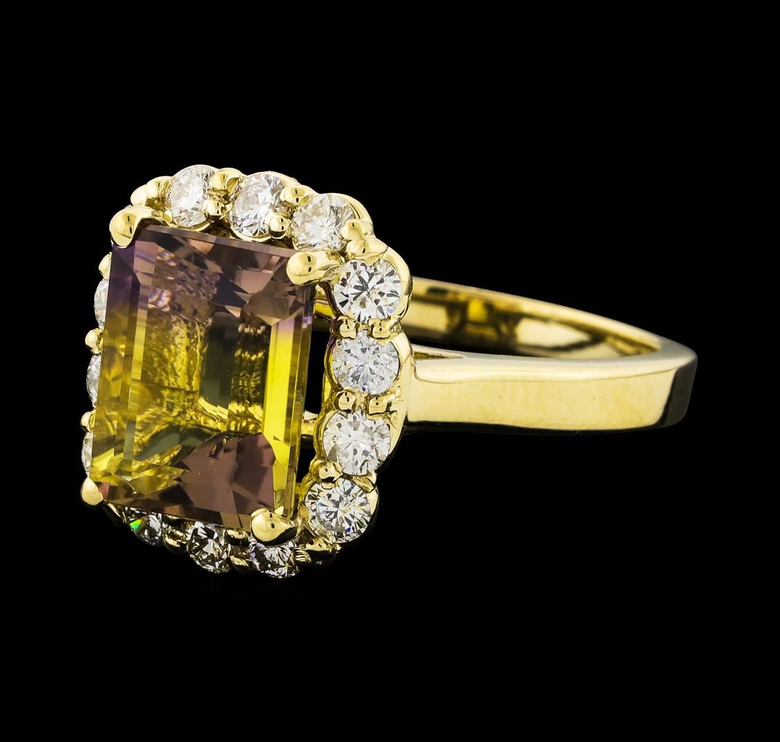 One Ametrine and Diamond Ring featuring: 14KT Yellow Gold with a total weight of 5.86 grams, One Ametrine stone with a total weight of 3.73ct, and 14 Diamonds with a total weight of 0.78ctw.
