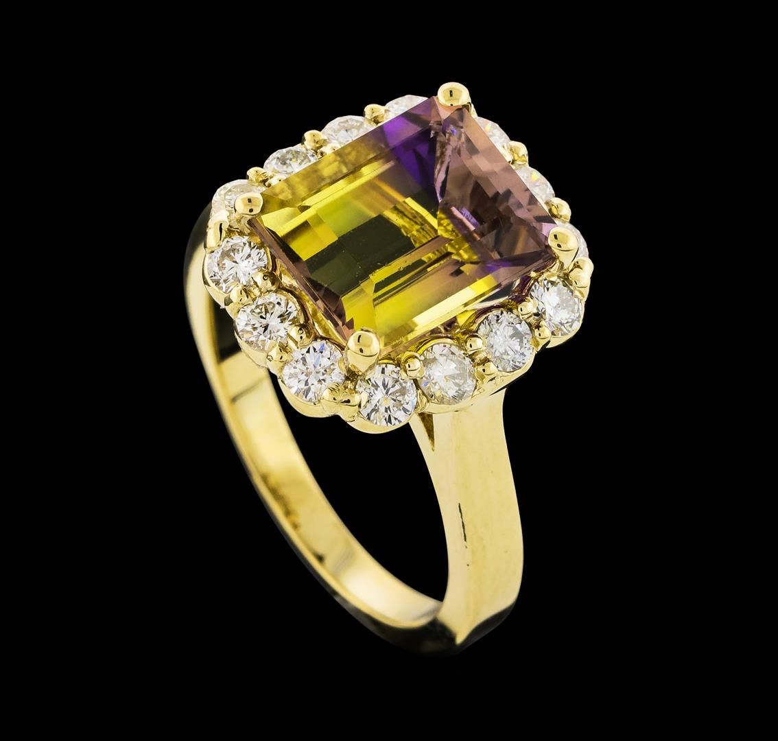 One Ametrine and Diamond Ring featuring: 14KT Yellow Gold with a total weight of 5.86 grams, One Ametrine stone with a total weight of 3.73ct, and 14 Diamonds with a total weight of 0.78ctw.