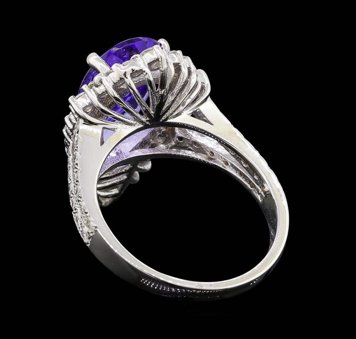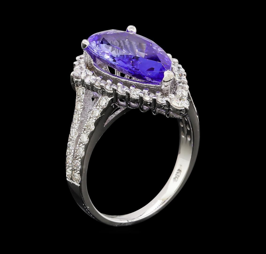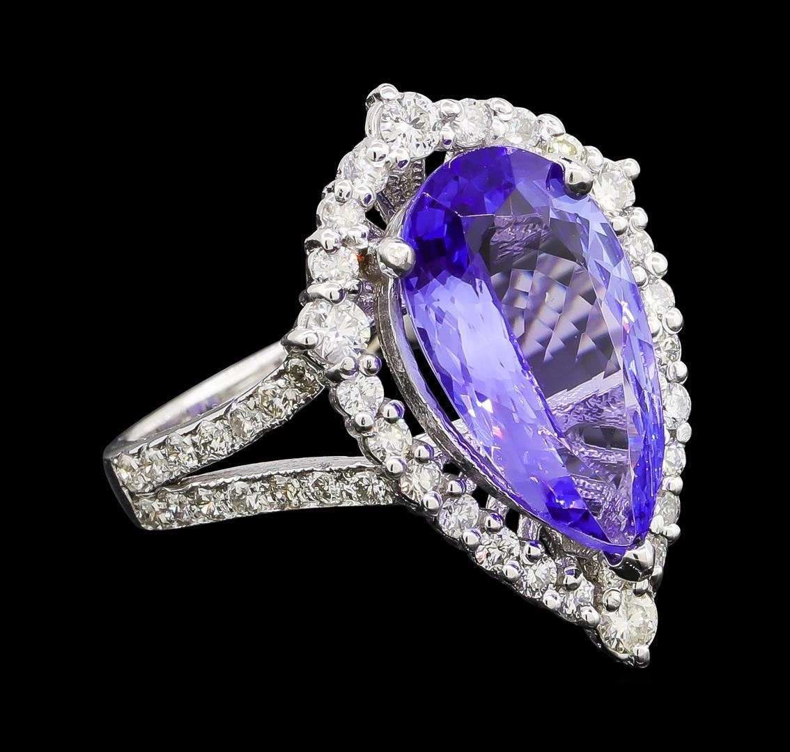One electronically tested 14KT white gold lady's cast fashion ring with a split shank basket halo with a bright polish with milgrain detailing finish. The featured lady's ring has a shank measuring 2.04 millimeters wide. Identified with markings of 'K14'. Condition is new, good workmanship. Containing: One prong set pear modified brilliant cut natural tanzanite, measuring 15.00 x 8.25 x 4.29mm, (depth est.) 5%. bulge factor, approximate weight of 3.73ct., clarity is eye clean, medium, moderately strong, bluish violet color, (GIA bV 5/4), cut is very good. Transmitting light with no distortion, transparent. Colored gemstones are presumed to have been subjected to commonly used enhancement processes. Graded in the setting. Four prong set round brilliant cut diamonds, measuring 2.20 - 2.10 x 1.33mm (depth est.) approximate total weight of 4 Stones = 0.15ct. Graded in the setting. Clarity SI-1 to I-1. Color: H - I Cut Good Twenty prong set round brilliant cut diamonds, measuring 1.60 - 1.55 x 0.98mm (depth est.) approximate total weight of 20 Stones = 0.30ct. Graded in the setting. Clarity SI-1 to SI-2. Color: G - H Cut Good Twenty-Eight prong set round brilliant cut diamonds, measuring 1.50 - 1.45 x 0.92mm (depth est.) approximate total weight of 28 Stones = 0.35ct. Graded in the setting. Clarity SI-1 to SI-2. Color: H - I Cut Good. Total Weight of Colored Stones 3.73ct.. Total Weight of Diamonds 0.80ct.. Total Weight of Ring 5.10gm. GAS Appraised.