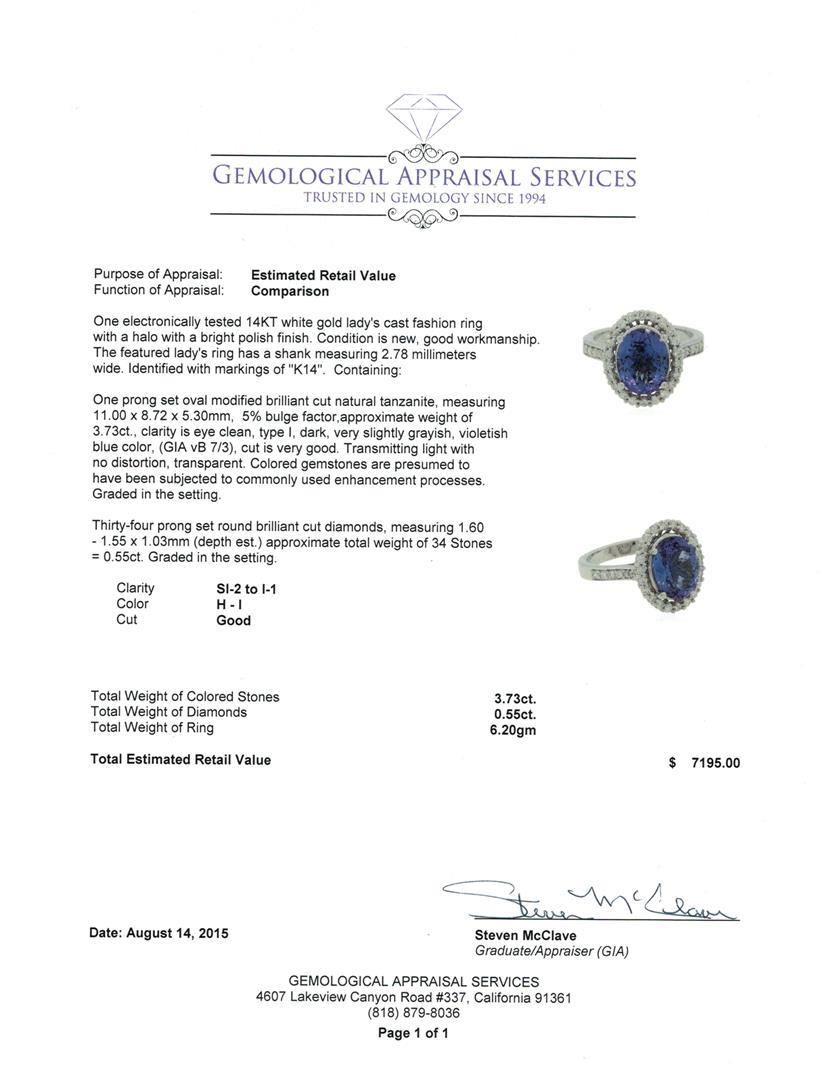 One electronically tested 14KT white gold lady's cast fashion ring with a halo with a bright polish finish. The featured lady's ring has a shank measuring 2.78 millimeters wide. Identified with markings of "K14". Condition is new, good workmanship. Containing: One prong set oval modified brilliant cut natural tanzanite, measuring 11.00 x 8.72 x 5.30mm, 5% bulge factor, approximate weight of 3.73ct., clarity is eye clean, type I, dark, very slightly grayish, violetish blue color, (GIA vB 7/3), cut is very good. Transmitting light with no distortion, transparent. Colored gemstones are presumed to have been subjected to commonly used enhancement processes. Graded in the setting. Thirty-Four prong set round brilliant cut diamonds, measuring 1.60 - 1.55 x 1.03mm (depth est.) approximate total weight of 34 Stones = 0.55ct. Graded in the setting. Clarity: SI-2 to I-1. Color: H - I. Cut Good. Total Weight of Colored Stones 3.73ct. Total Weight of Diamonds 0.55ct. Total Weight of Ring 6.20gm.