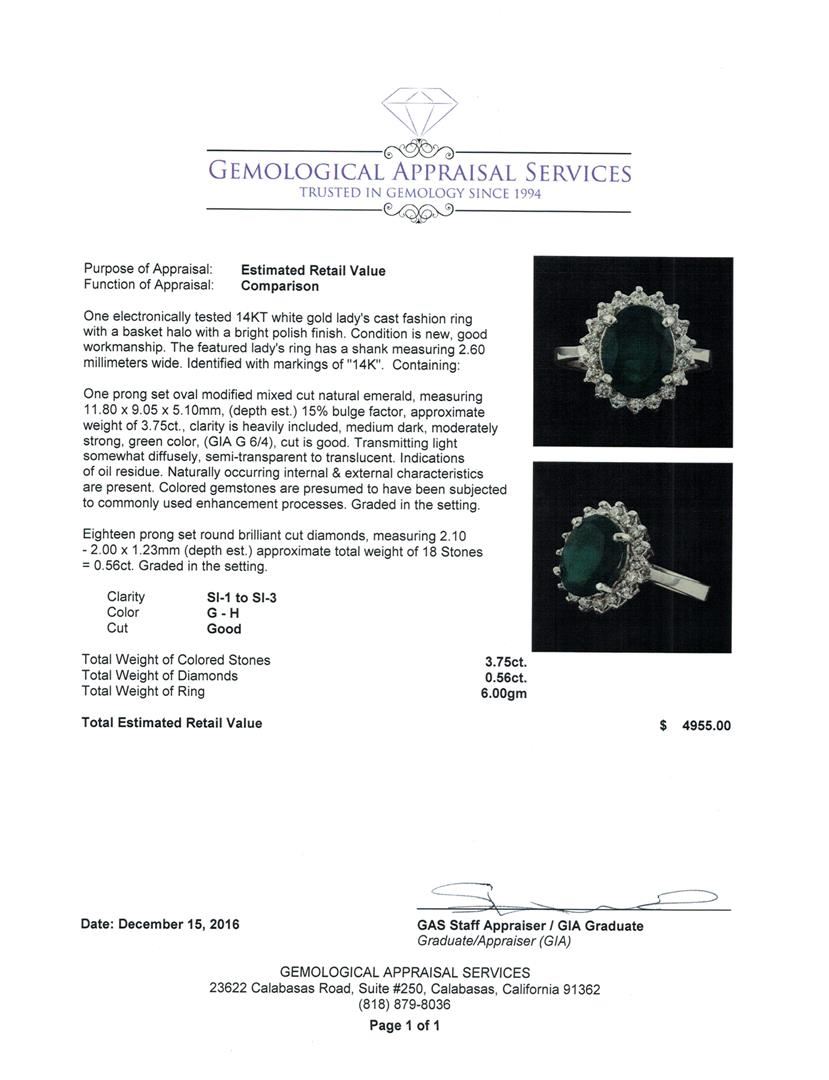 One electronically tested 14KT white gold lady's cast fashion ring with a basket halo with a bright polish finish. The featured lady's ring has a shank measuring 2.60 millimeters wide. Identified with markings of '14K'. Condition is new, good workmanship. Containing: One prong set oval modified mixed cut natural emerald, measuring 11.80 x 9.05 x 5.10mm, (depth est.) 15%. bulge factor, approximate weight of 3.75ct., clarity is heavily included, medium dark, moderately strong, green color, (GIA G 6/4), cut is good. Transmitting light somewhat diffusely, semi-transparent to translucent. Indications of oil residue. Naturally occurring internal & external characteristics are present. Colored gemstones are presumed to have been subjected to commonly used enhancement processes. Graded in the setting. Eighteen prong set round brilliant cut diamonds, measuring 2.10 - 2.00 x 1.23mm (depth est.) approximate total weight of 18 Stones = 0.56ct. Graded in the setting. Clarity SI-1 to SI-3. Color: G - H Cut Good. Total Weight of Colored Stones 3.75ct.. Total Weight of Diamonds 0.56ct.. Total Weight of Ring 6.00gm. GAS Appraised.