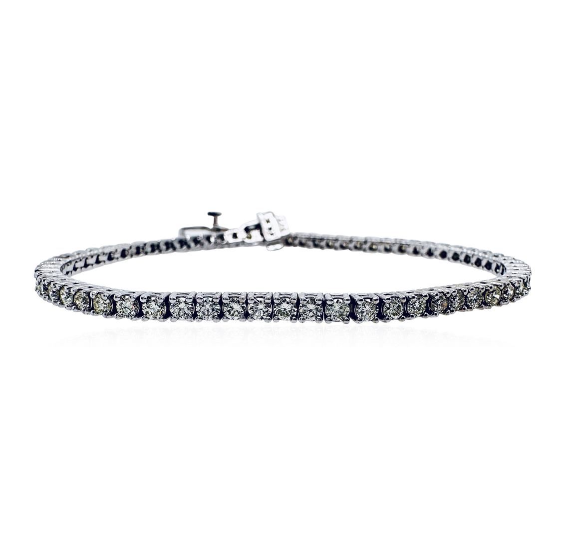 One electronicaly tested 14KT white gold lady's combination cast & assembled fashion straight line tennis bracelet with a tongue clasp with fold-under safety with a basket motif with a bright polish finish. Condition is new. good workmanship. The featured Iady's Bracelet measures approximately 7.00 inches in length. ldentfied with markings of "14K". Containing Sixty-nine prong set round brilliant cut diamonds, measuring 2.40-2.35 X 1.48mm (depth est:.) approximate total weight of 69 Stones = 3.77ct. Graded in the seting. H-J SL-1 to SL-2. Very Good. Total weight of Diamonds: 3.77ct. Total Estimated Retail Value: 10850.00