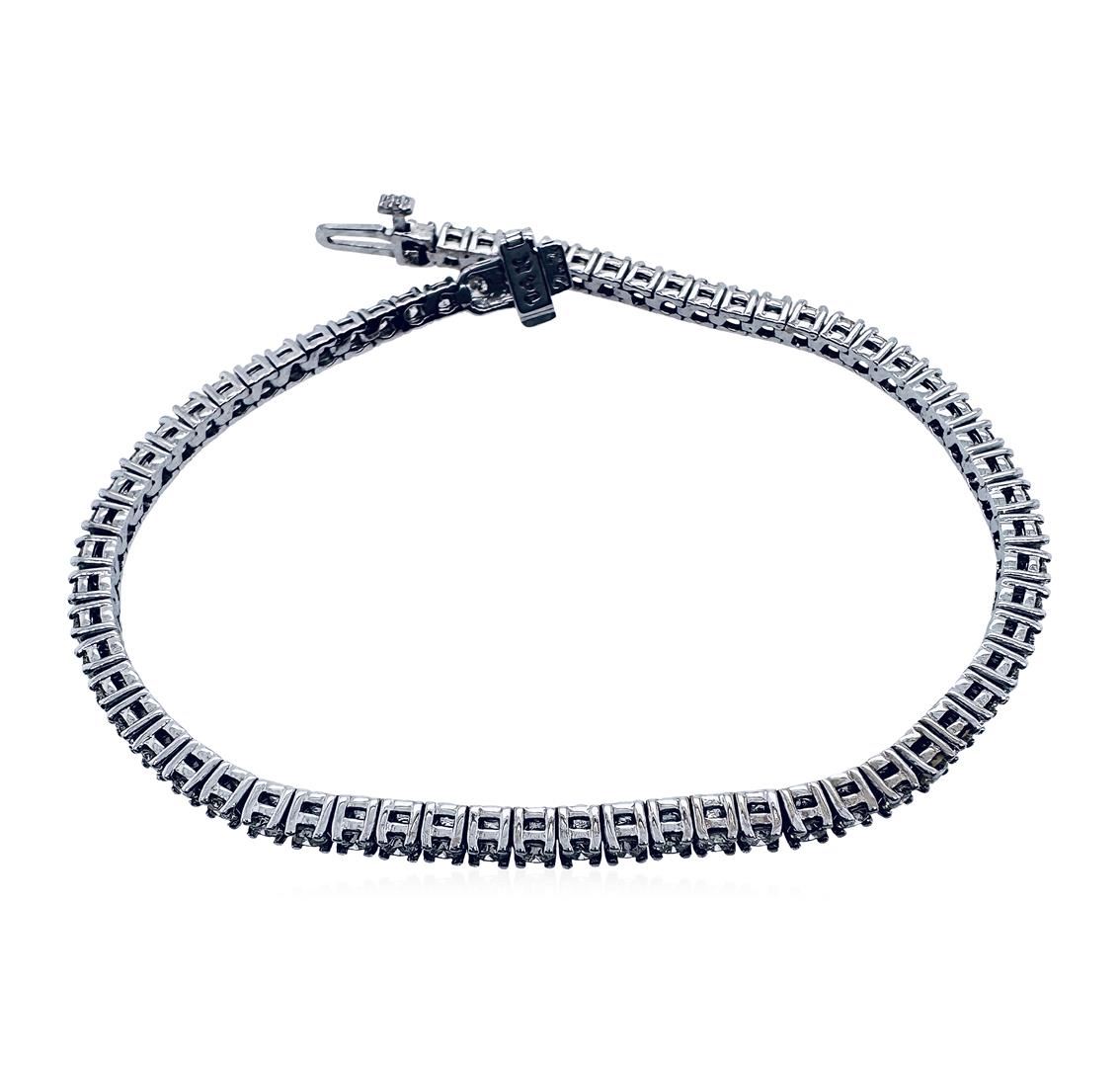 One electronicaly tested 14KT white gold lady's combination cast & assembled fashion straight line tennis bracelet with a tongue clasp with fold-under safety with a basket motif with a bright polish finish. Condition is new. good workmanship. The featured Iady's Bracelet measures approximately 7.00 inches in length. ldentfied with markings of "14K". Containing Sixty-nine prong set round brilliant cut diamonds, measuring 2.40-2.35 X 1.48mm (depth est:.) approximate total weight of 69 Stones = 3.77ct. Graded in the seting. H-J SL-1 to SL-2. Very Good. Total weight of Diamonds: 3.77ct. Total Estimated Retail Value: 10850.00