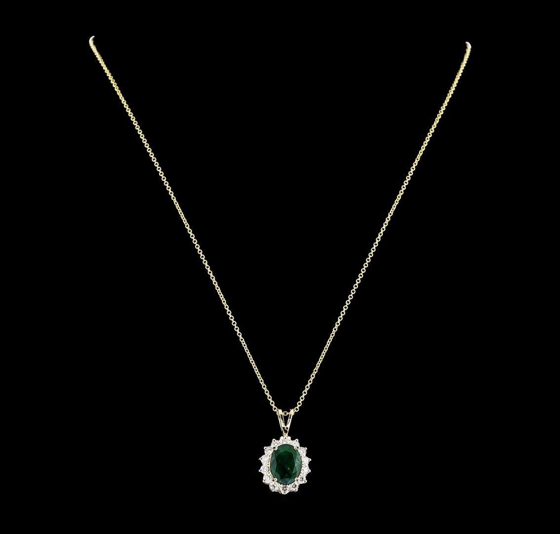 One electronically tested 14KT yellow gold lady's cast fashion pendant & chain 18.0' long, 1.2mm oval cable link with a lobster claw clasp with a basket halo with a bright polish finish. Identified with markings of '14K'. Condition is new, good workmanship. Containing: One prong set oval modified mixed cut natural emerald, measuring 11.11 x 8.60 x 6.11mm, (depth est.) 12%. bulge factor, approximate weight of 3.77ct., clarity is heavily included, medium dark, moderately strong, green color, (GIA G 6/4), cut is good. Transmitting light somewhat diffusely, semi-transparent to translucent. Naturally occurring internal & external characteristics are present. Indications of oil residue. Colored gemstones are presumed to have been subjected to commonly used enhancement processes. Graded in the setting. Fourteen prong set round brilliant cut diamonds, measuring 2.40 - 2.30 x 1.46mm (depth est.) approximate total weight of 14 Stones = 0.70ct. Graded in the setting. Clarity SI-1 to SI-3. Color: H - I Cut Good. Total Weight of Colored Stones 3.77ct.. Total Weight of Diamonds 0.70ct.. Total Weight of Pendant & Chain 5.00gm. GAS Appraised.