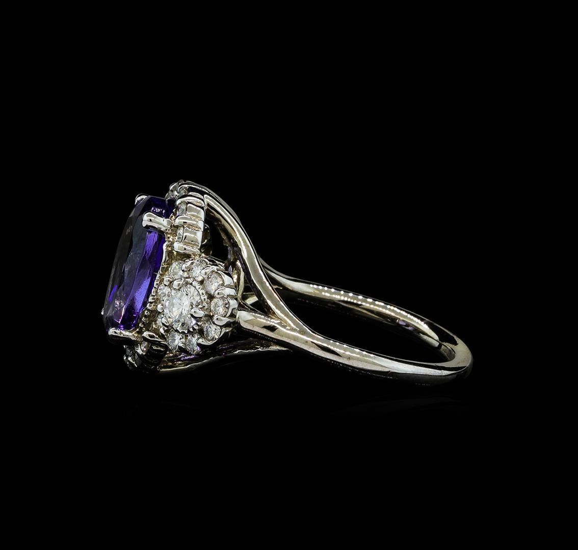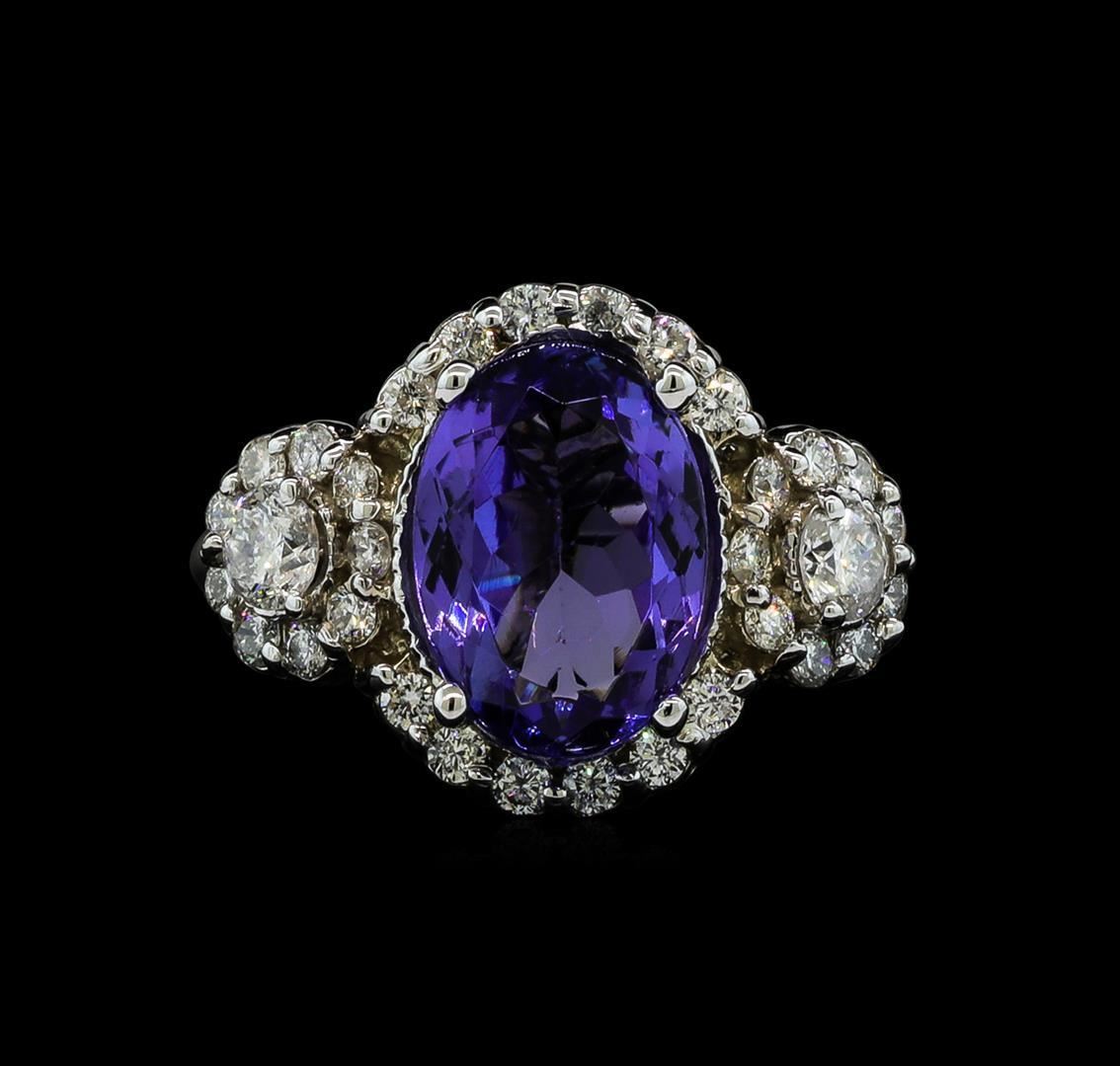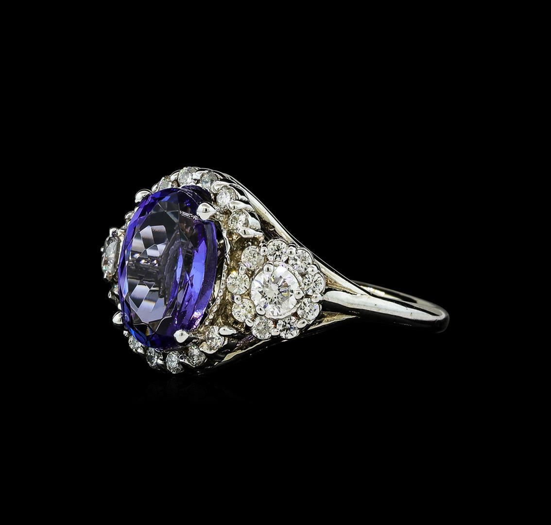 One electronically tested 14KT white gold lady's cast fashion ring with a scalloped cathedral shank with a bright polish finish. The featured lady's ring has a haloed three stone motif and a shank measuring 1.90 millimeters wide. Condition is new, good workmanship. Containing: One prong set oval modified brilliant cut natural tanzanite, measuring 11.50 x 8.11 x 4.92mm, (depth est.) 15%. bulge factor, approximate weight of 3.77ct., clarity is eye clean, medium light, moderately strong, violet color, (GIA V 4/4), cut is good. Transmitting light with no distortion, transparent. Colored gemstones are presumed to have been subjected to commonly used enhancement processes. Graded in the setting. Two prong set round brilliant cut diamonds, measuring 3.60 - 3.55 x 2.18mm (depth est.) approximate total weight of 2 Stones = 0.34ct. Graded in the setting. Clarity I-1. Color: I - J Cut Good Thirty prong set round brilliant cut diamonds, measuring 1.70 - 1.60 x 1.02mm (depth est.) approximate total weight of 30 Stones = 0.51ct. Graded in the setting. Clarity SI-1 to I-1. Color: H - I Cut Good. Total Weight of Colored Stones 3.77ct.. Total Weight of Diamonds 0.85ct.. Total Weight of Ring 6.40gm GAS Appraised.