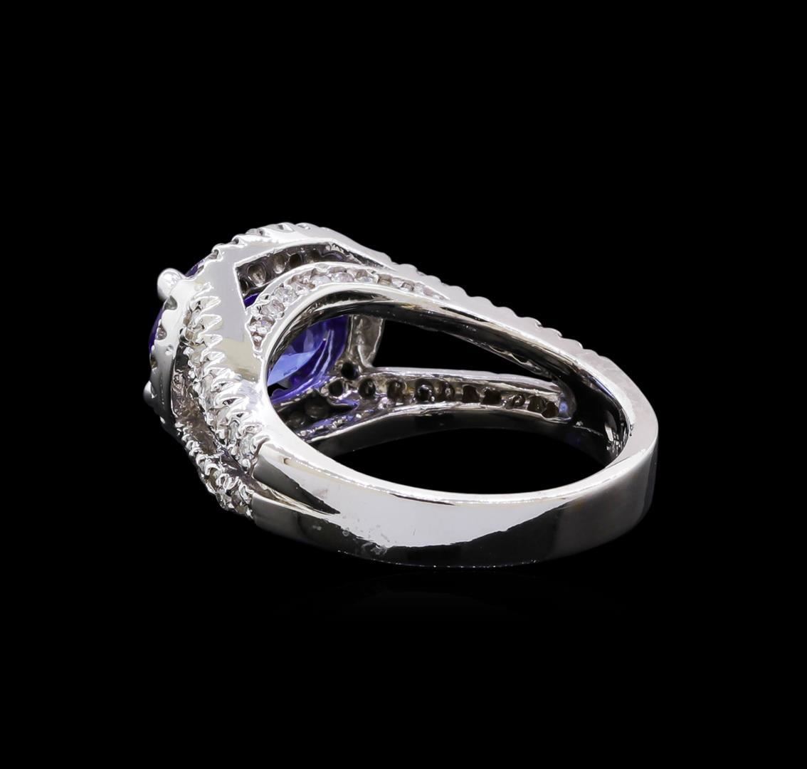 One electronically tested 14KT white gold ladies cast tanzanite and diamond ring with a bright polish finish. The featured tanzanite is set within a diamond bezel supported by a diamond set under gallery and diamond set split shoulders, completed by a three and one-half millimeter wide band. Identified with markings of "14K". Condition is new, good workmanship. Containing: One prong set oval mixed cut natural tanzanite, measuring 10.75 x 8.10 x 5.80mm, 6%. bulge factor, approximate weight of 3.77ct., clarity is eye clean, type I, medium dark, very slightly grayish, bluish violet color, (GIA bV 6/3), cut is good. Transmitting light with no distortion, transparent. Graded in the setting. Tanzanite is a very rare gemstone that is only found in the country of Tanzania. Originally discovered in 1967. Tiffany & Company, named the stone Tanzanite. It is found in the Usumburu Mountains that border the Umba Valley of northern Tanzania. Tanzanite occurs in gray, brown, violet, blue, reddish-purple, & green. The gem is interesting because of its exceptional pleochroism. Rotated in different directions a tanzanite will exhibit multiple changes of color. Tanzanite has a low tolerance to ultrasonic cleaning, and should not be cleaned using this method. Eighty prong set round brilliant cut diamonds, measuring 1.30 - 1.10 x 0.72mm (depth est.) approximate total weight of 80 Stones = 0.60 ct. Graded in the setting. Clarity: I-2 to I-3. Color: H - J. Total Weight of Colored Stones 3.77ct. Total Weight of Diamonds 0.60 ct. Total Weight of Ring 8.21gm.