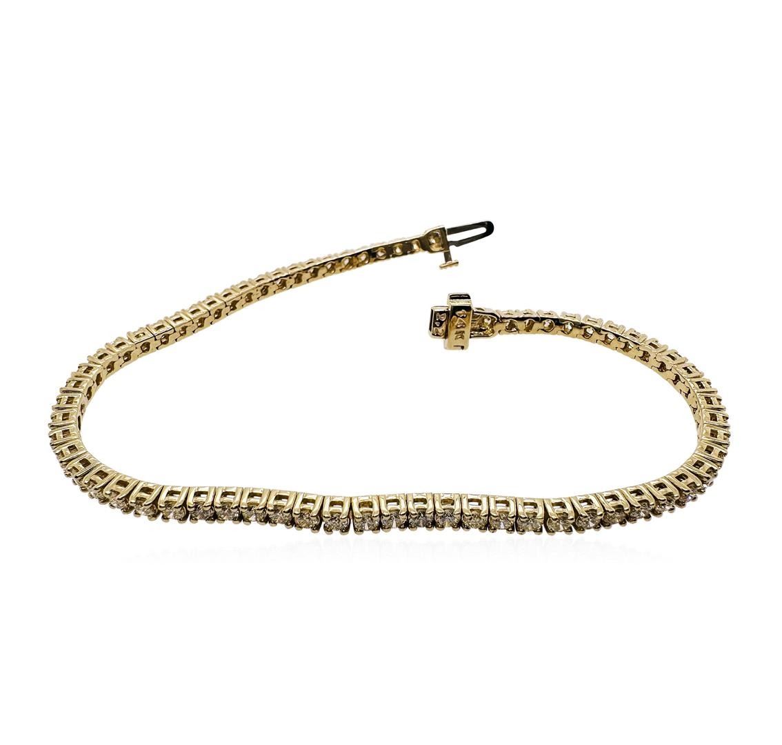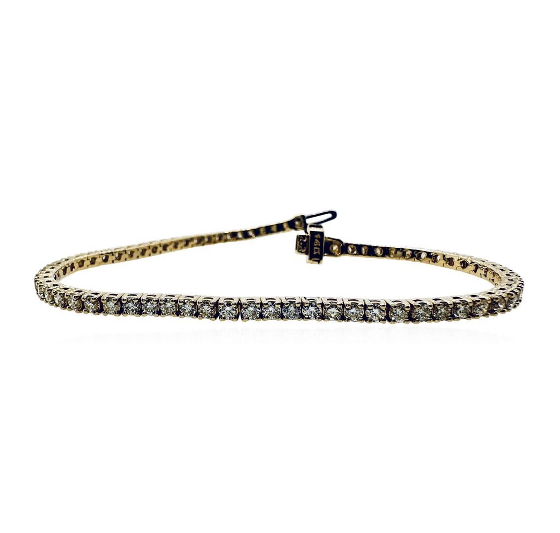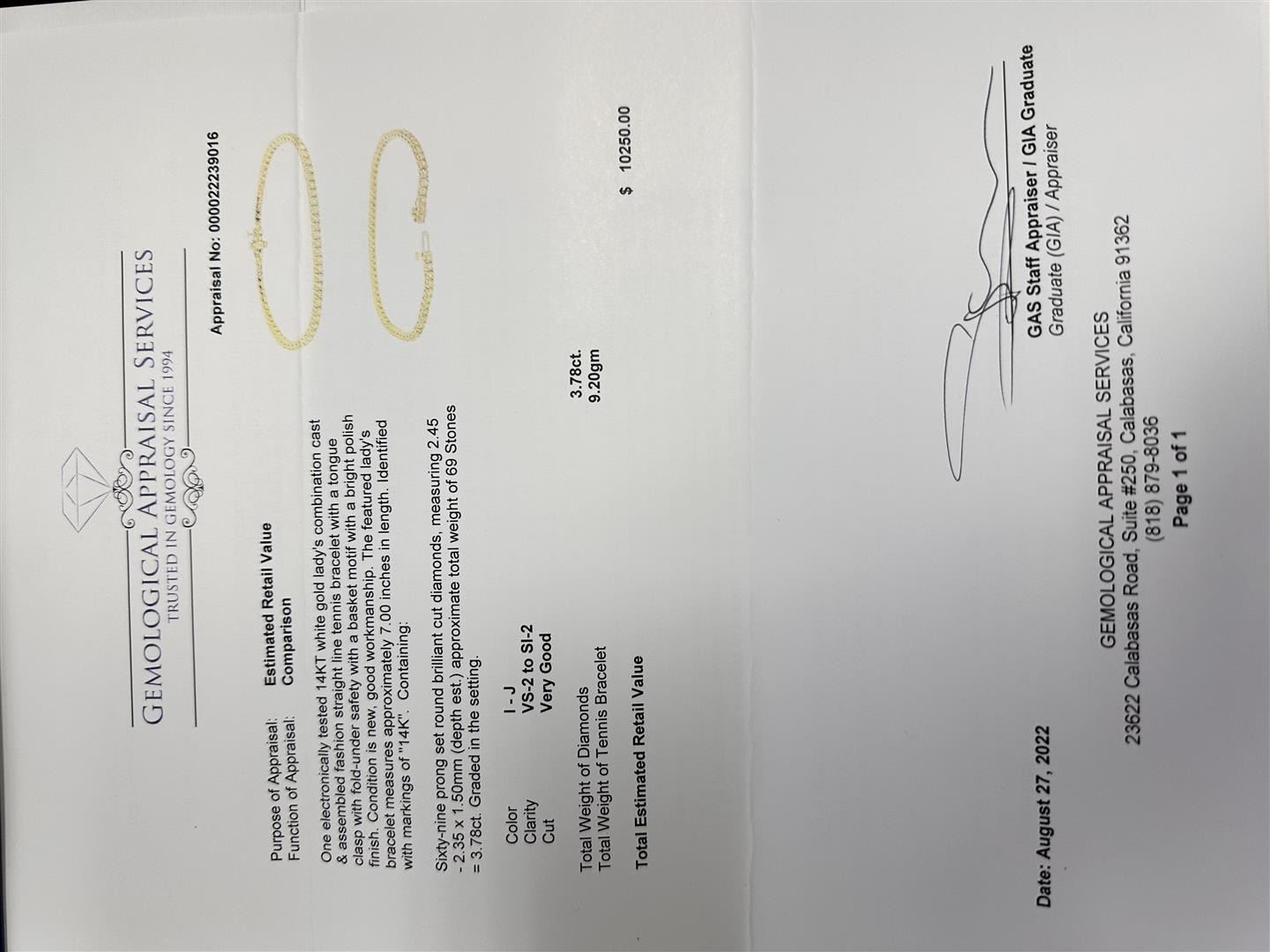 One electronically tested 14KT white gold lady's combination cast & assembled fashion straight line tennis bracelet with a tongue clasp with fold-under safety with a basket motif with a bright polish finish. Condition is new, good workmanship. The featured lady's bracelet measures approximately 7.00 inches in length. Identified with markings of 14K. Containing: 69 prong set round brilliant cut diamonds, approximate total weight of 69 stones = 3.78 ctw. Graded in the setting. Total weight of Diamonds: 3.78 ctw. Total estimated retail value: $10250